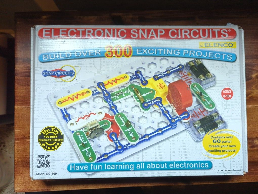 Elenco Electronic Snap Circuits - SC-300 - Science Learning Discovery - Excellent Let your little one have fun learning to build circuits with these colorful Electronic Snap Circuits. Each one features more than 60 parts that easily snap together. The snap circuits toy can be used to make interesting circuits, encouraging educational play that teaches your little one about electricity. All of the parts have colored graphics that represent their real electronic names and symbols. This educational toy comes with a complete instruction manual and project guide that helps you to guide your child through exploring over 300 experiments. Some of the projects include making circuits for doorbells, radios, alarms, flash lights, laser light, street lamps, a lie detector and a fan modulator. This kids' snap circuits toy runs on four AA batteries that are sold separately. It is ideal for children age 8 years and older. Snap Circuits comes with over 60 pieces to create 305 different electronic projects. The pieces, which include snap wires, a slide switch, a resistor, a microphone, and capacitors, snap together easily onto the included plastic grid--no soldering required. Each piece is numbered and color-coded to make identifying them easy. These components combine to create working circuit boards just like the ones found inside televisions, radios, and other electronic devices. The original box has some minor damage to the top. Please see pictures