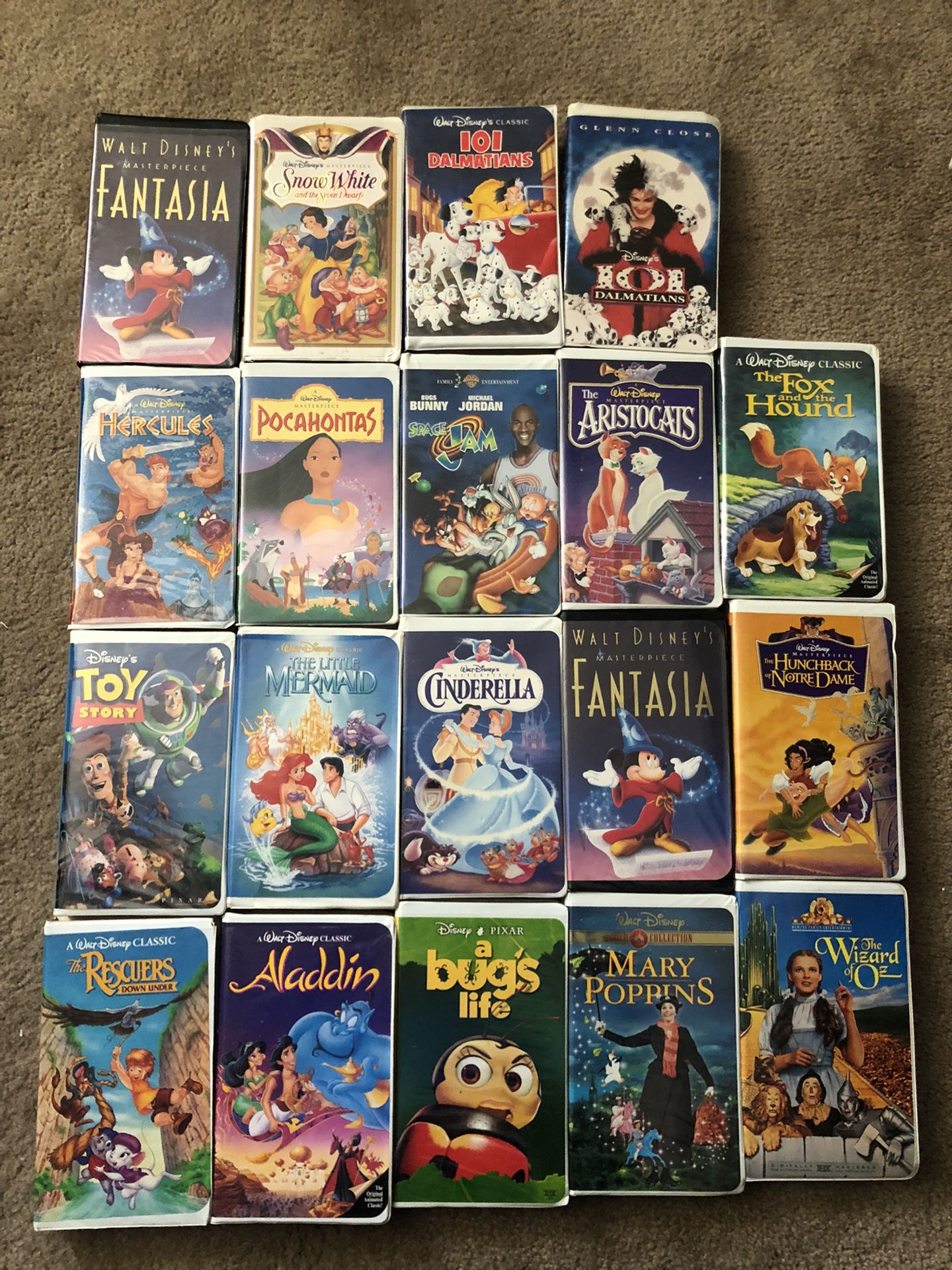 Little mermaid(banned cover) $20 Toy Story $10 101 Dalmatians(animated) $10 101 Dalmatians $10 The rescuers down Under $10 Aladdin $15 Bugs life $10 Mary Poppins $10 The fox and the hound $20 Hercules $10 Space jam $10 The Aristocats $10 Pocahontas $10 Cinderella $15 The hunchback of Notre Dame $10 Wizard of Oz $15 Fantasia $20 Snow White $20 $200 for everything obo