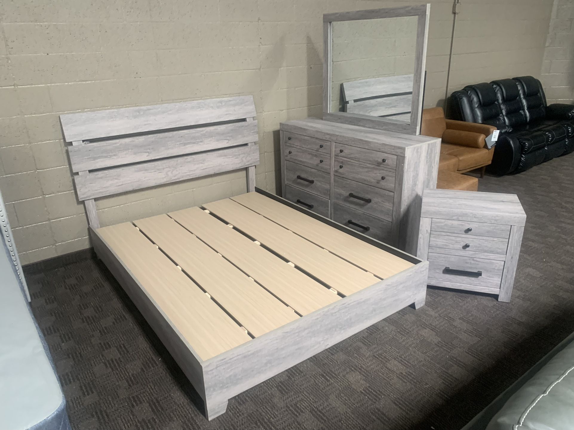 Brand new in box queen bedroom set. Includes queen bed, dresser, mirror and nightstand. Also available in king Delivery and payment plans available