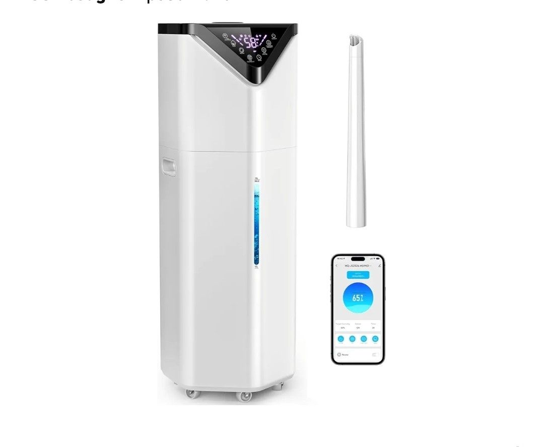 9923: New 5Gal Smart Humidifier Large Room up to 2800ft², 1000mL/h, APP & Remote Control, 180° Auto Rotating Nozzle, 24H Timer, 60H Supersized Cool Mist Humidifiers for Whole House Home Office Plants Brand: AERZY Special Feature 24 H Timer, 6 Mist Levels, Customize Humidity 40%~90%, 180° Auto-Rotating Spray, Aroma Diffuser, 7-color Ambient Light,, Low Water Indicator, Auto Shut Off, Sleep Mode, Remote Control & APP Control & Touch Control, Water Level Window, Removable Tank, Top Fill, 6 Flexible Wheels24 H Timer, 6 Mist Levels, Customize Humidity 40%~90%, 180° Auto-Rotating Spray, Aroma Diffuser, 7-color… See more Color: White Capacity: 5 Gallons Floor Area: 2800 Square Feet Operation Mode: Ultrasonic 𝗜𝗻𝗱𝘂𝘀𝘁𝗿𝗶𝗮𝗹-𝗚𝗿𝗮𝗱𝗲 𝟭𝟬𝟬𝟬𝗺𝗟/𝗛 𝗢𝘂𝘁𝗽𝘂𝘁 & 𝟲𝟬-𝗛𝗼𝘂𝗿 𝗥𝘂𝗻𝘁𝗶𝗺𝗲 Powered by advanced triple-core atomization technology, this cool mist AERZY humidifier delivers an impressive 1000mL/H mist output—enough to cover spaces up to 2800 sq. ft. The large 5-gallon tank ensures up to 60 hours of continuous operation on the lowest setting, delivering non-stop comfort day and night, providing relief from dry air all winter long. 𝗦𝗺𝗮𝗿𝘁 𝗔𝗣𝗣 & 𝗥𝗲𝗺𝗼𝘁𝗲 𝗖𝗼𝗻𝘁𝗿𝗼𝗹 𝗳𝗼𝗿 𝗨𝗹𝘁𝗶𝗺𝗮𝘁𝗲 𝗖𝗼𝗻𝘃𝗲𝗻𝗶𝗲𝗻𝗰𝗲 Gain ultimate control at your fingertips. Seamlessly manage your home's humidity from anywhere using your smartphone via the Tuya app (Note: requires 2.4GHz network). The included remote control also offers convenient operation from up to 20 feet away, allowing you to adjust settings without moving a muscle. 𝟭𝟴𝟬°𝗔𝘂𝘁𝗼-𝗥𝗼𝘁𝗮𝘁𝗶𝗻𝗴 & 𝗘𝘅𝘁𝗲𝗻𝗱𝗲𝗱 𝗦𝗽𝗿𝗮𝘆 𝗣𝗶𝗽𝗲 Our unique 18-inch extended spray pipe features 180°automatic rotation to distribute mist evenly throughout your space. This targeted delivery system ensures optimal humidity dispersion, prevents concentrated moisture,and effectively protects your furniture and floors from getting wet. Making it perfect for your whole house, bedroom, large room, home, office, warehouse, or even for protecting your wooden furniture and thriving. 𝗙𝘂𝗹𝗹𝘆 𝗖𝘂𝘀𝘁𝗼𝗺𝗶𝘇𝗮𝗯𝗹𝗲 𝗖𝗼𝗺𝗳𝗼𝗿𝘁 & 𝗦𝗲𝘁-𝗜𝘁-𝗮𝗻𝗱-𝗙𝗼𝗿𝗴𝗲𝘁-𝗜𝘁 Choose from 6 mist levels to match your exact humidity preference. Activate the 40-90% RH Auto Humidistat to maintain your ideal humidity level automatically. Enjoy added convenience with the 24-hour timer and rest easier with sleep mode—which silences operation and turns off all lights. 𝗘𝗳𝗳𝗼𝗿𝘁𝗹𝗲𝘀𝘀 𝗠𝗼𝗯𝗶𝗹𝗶𝘁𝘆 & 𝗧𝗶𝗽-𝗥𝗲𝘀𝗶𝘀𝘁𝗮𝗻𝘁 𝗗𝗲𝘀𝗶𝗴𝗻 Forget clumsy 4-wheel humidifiers! Our upgraded 6-wheel system glides smoothly in any direction with superior stability—no tipping worries. Built-in handles offer added control. It glides effortlessly across rooms—from bedroom to office to living area. 𝗔𝗿𝗼𝗺𝗮 𝗣𝗮𝗱 𝗧𝗿𝗮𝘆 + 𝟳-𝗖𝗼𝗹𝗼𝗿 𝗠𝗼𝗼𝗱 𝗟𝗶𝗴𝗵𝘁 Enhance relaxation with the built-in aroma pad tray (note: do not add oils directly to the water tank, as it may cause damage). Set the mood with 7 soft LED colors, creating a calming atmosphere day or night, while the large water tank and powerful performance make it the complete humidification solution. 5Gal Smart Humidifier Large Room up to 2800ft², 1000mL/h, APP & Remote Control, 180° Auto Rotating Nozzle, 24H Timer, 60H Supersized Cool Mist Humidifiers for Whole House Home Office Plants