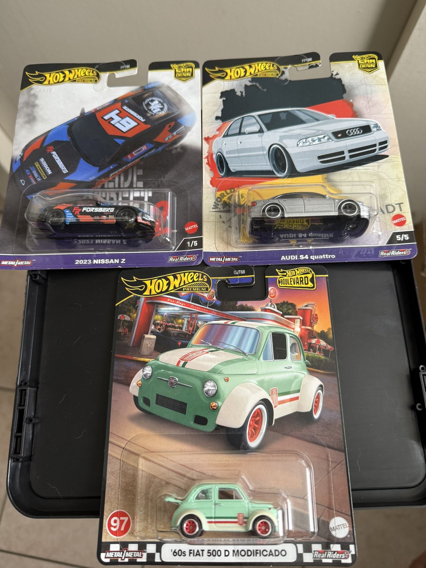 3 Hot wheels premium good in mint condition no scratches the 2023 Nissan Z does have bending of the box of the bottom left corner as you can see on the other picture but other then that all the cars are good and in well condition any question you may want to ask feel free to message!!