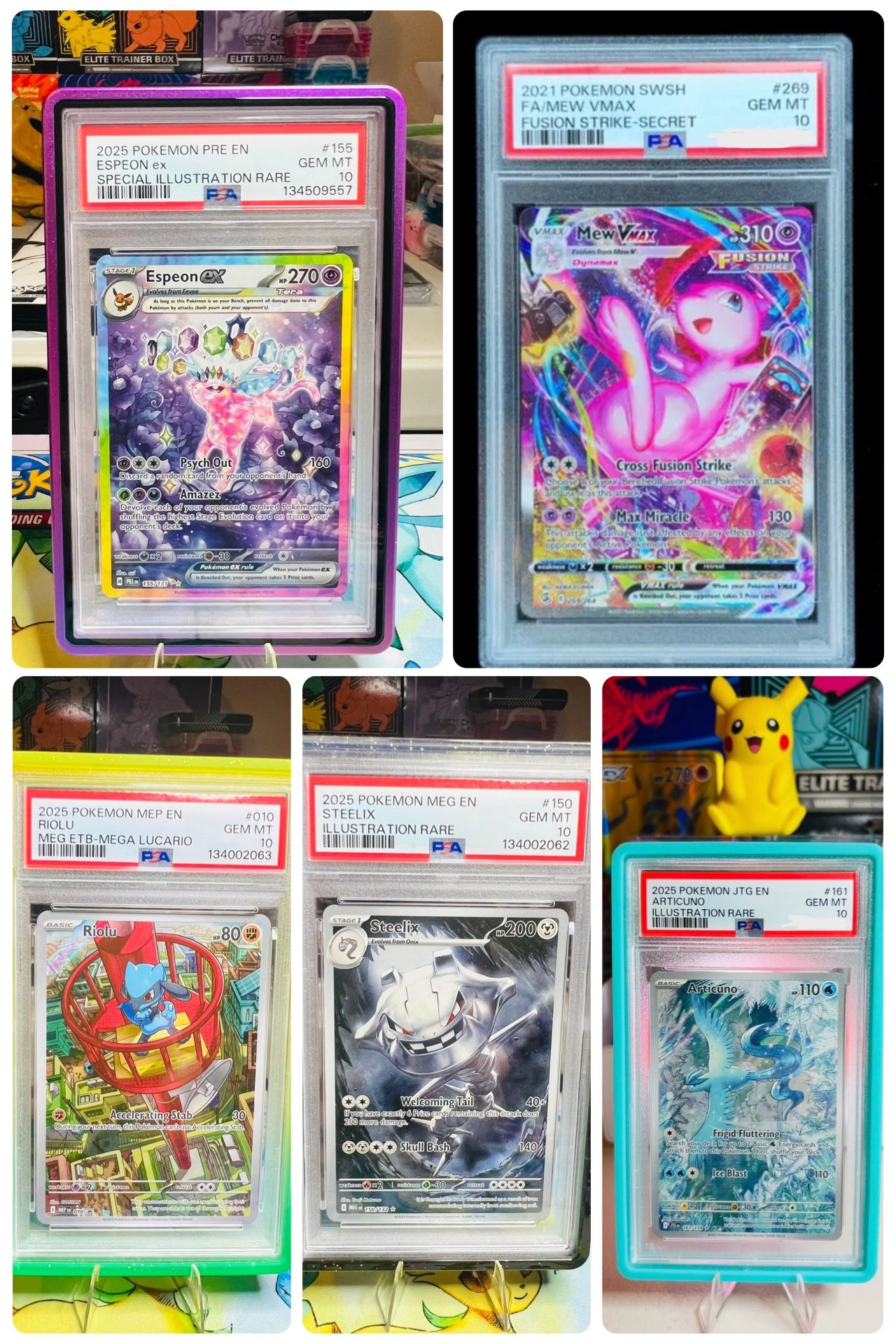 Pokemon Slabs PSA 10 Espeon ex 155 PSA 10 $850 Riolu #010 PSA 10 $165 Steelix #150 PSA 10 $165 Mew Vmax 269 PSA 10 $365 Articuno #165 PSA 10 $165 Guard NOT included moonbreon Umbreon 151 scarlet & violet prismatic evolutions ETB Binder Sylveon Espeon Vaporeon Flareon Glaceon Jolteon Leafeon Gengar Eevee Pikachu Mewtwo Greninja Snorlax Surging Sparks Stellar Crown Twilight Masquerade Paldean Fates Obsidian Flames Evolving Skies Prismatic Journey Together Mewtwo Mega Black & White Reshiram Zekrom destined Rivals Victini Black Bolt White Flare Mega phantasmal flames