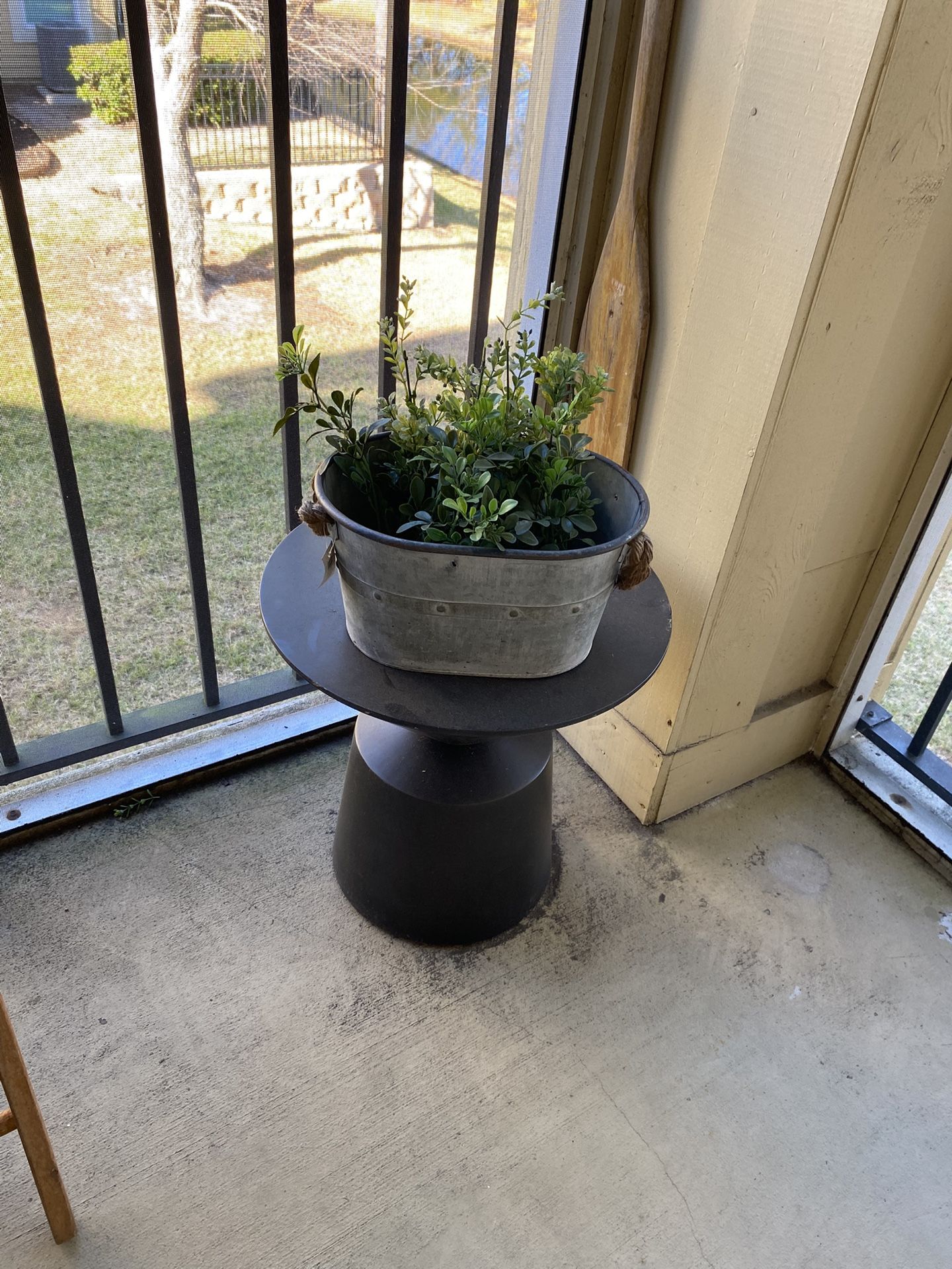 Metal and heavy. Can be used indoor or outdoor.