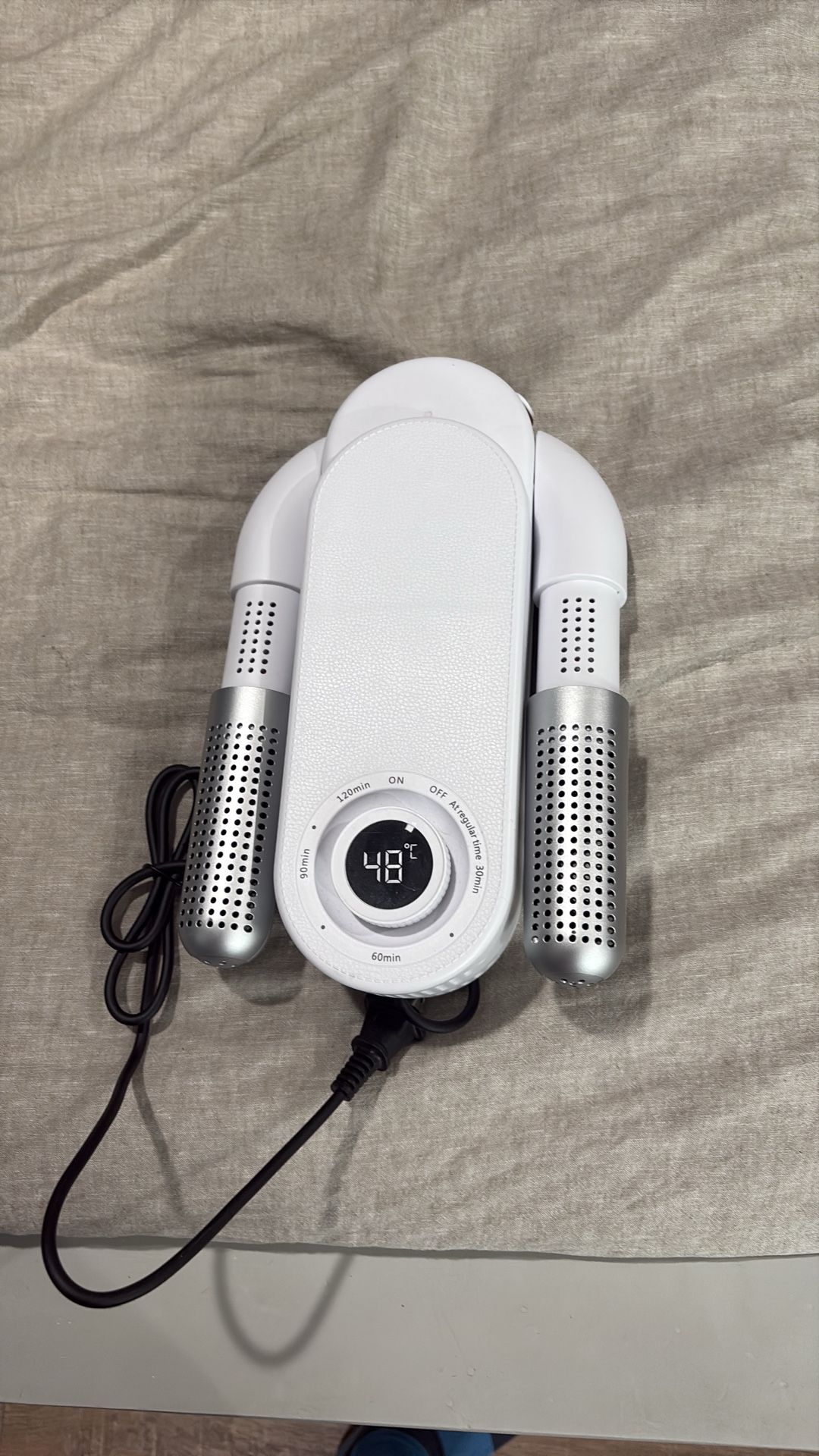Plug into wall and put timer on to dry gloves like boxing gloves or any shoes, wrestling shoes, boxing shoes, running shoes, basketball shoes