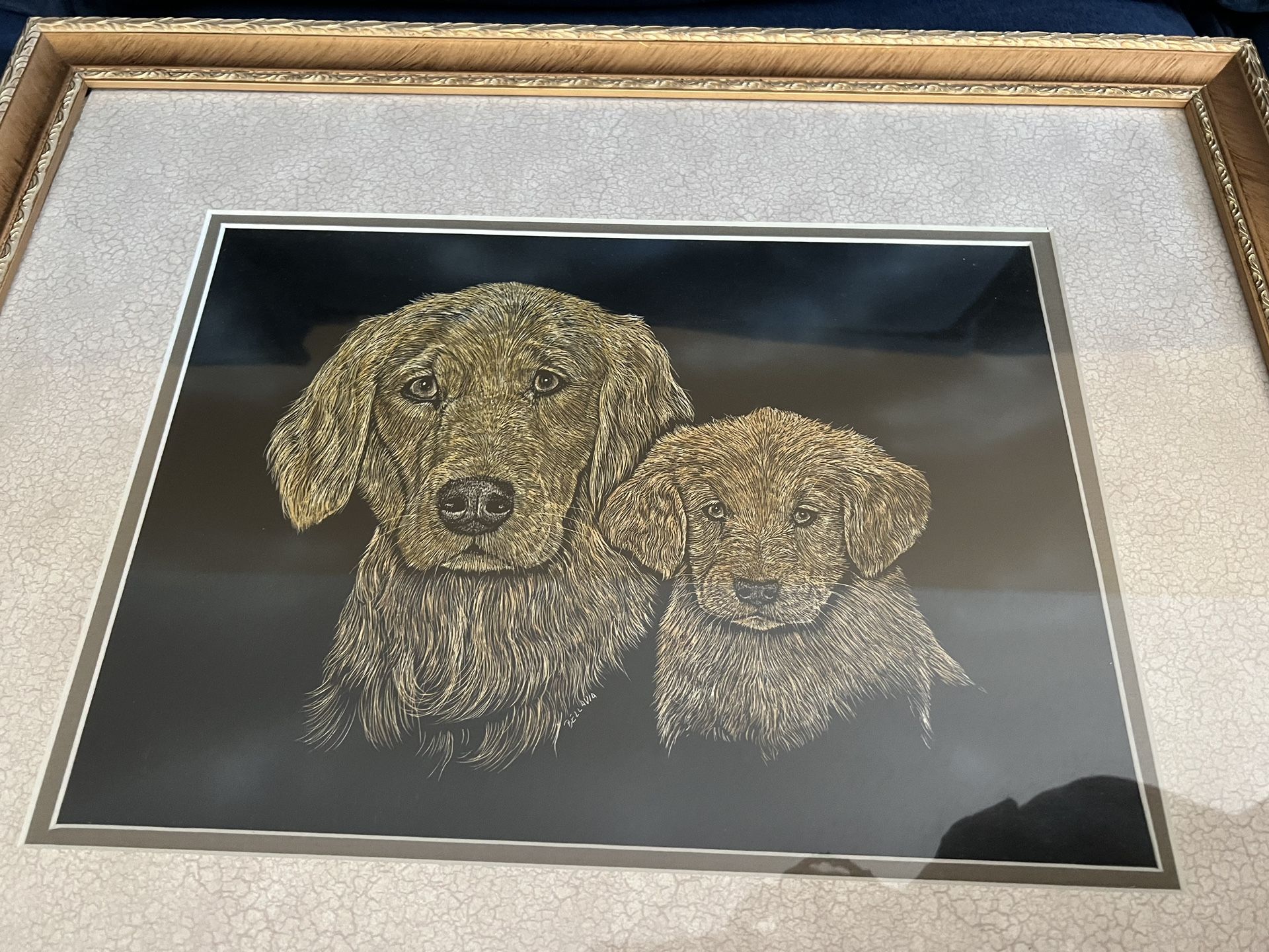 Bellavia Sketch Print Golden Retriever And Puppy Double Matted & Framed. This portrait paints the adult golden with a puppy on a black background with hues of gray like a night sky. The frame is absolutely sunning with an added shimmer. The combination ensemble of the portrait and the print give it a realistic feel. There is a sawtooth hanger in back that you can apply to the frame. The frame measures approximately 23” X 19”. In very good shape with minimal wear. Please review all photos as they are part of the description.