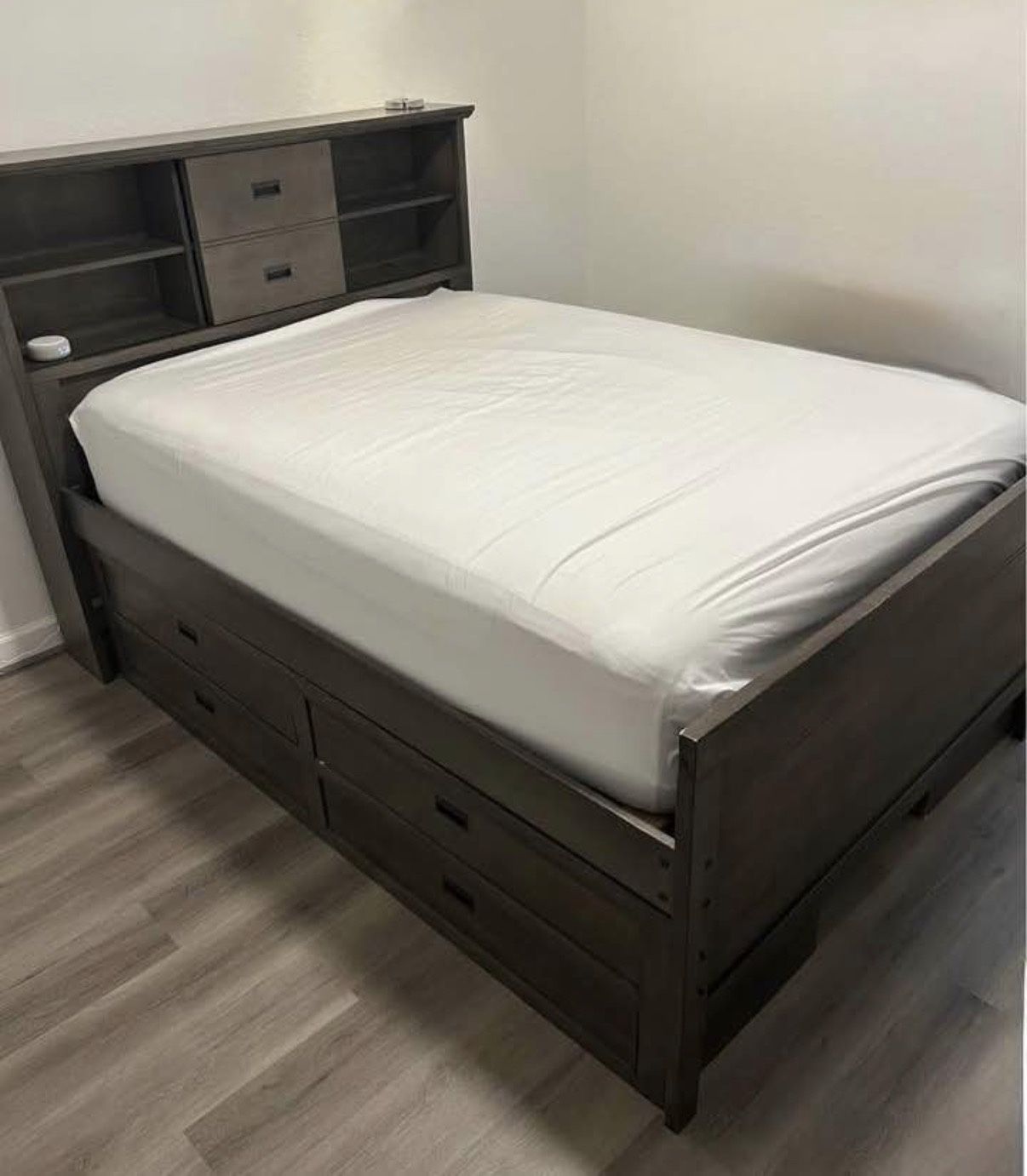 Living Spaces Full size bedroom set. Tons of storage. Bed has 8 storage drawers. 4 on each side. Headboard has premade reinforced openings so you can easily plug chargers in and rest them on the headboard by lamp there. In perfect condition with no scratches at all. Awesome color that is perfect for either a girl or a boy. Tons of storage. Matching nightstand included. Bought at Living Spaces barely 3 years ago. Only selling because my kid got a bigger bed and as such changed sets.