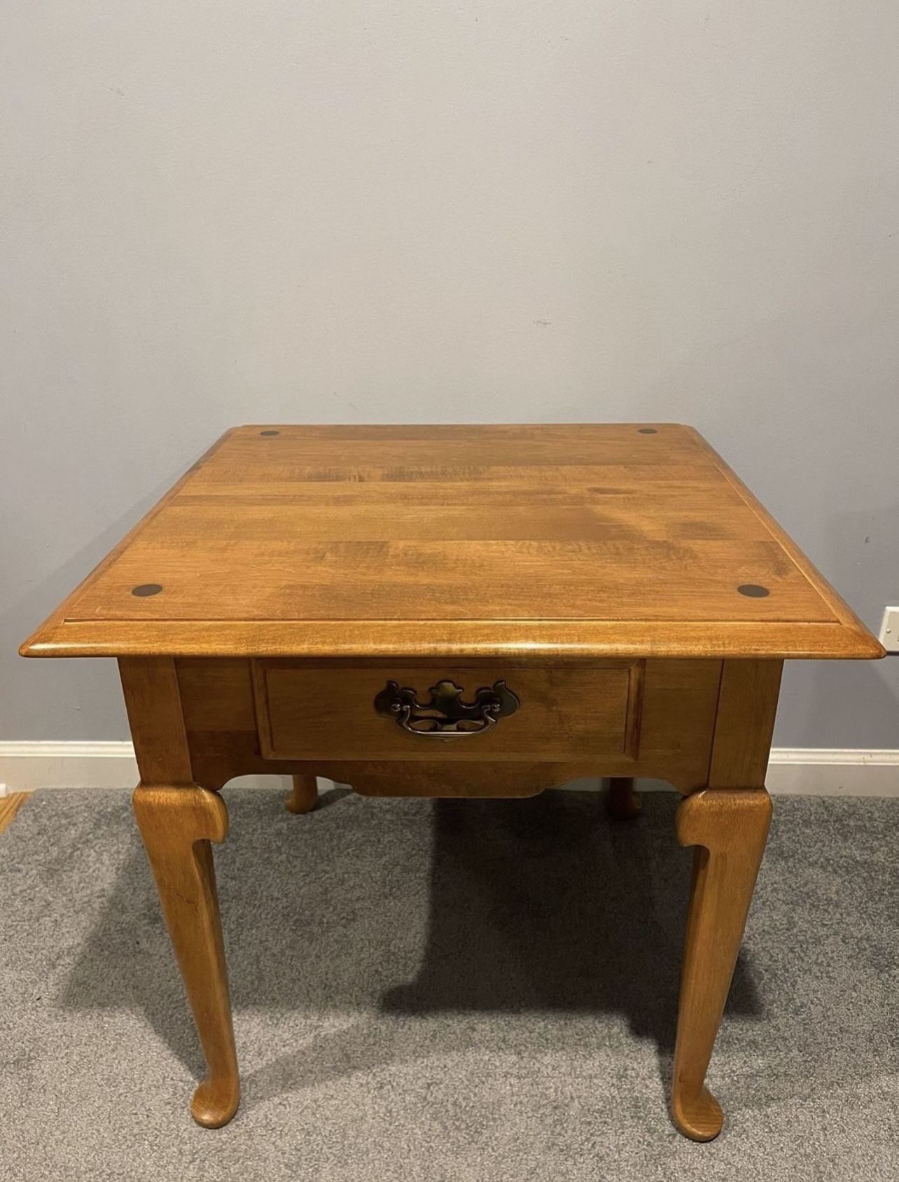 80s Ethan Allen Heirloom Nutmeg Maple Early American Style Accent End Table Top 24" x 24" Height 22.5" Cash and carry only