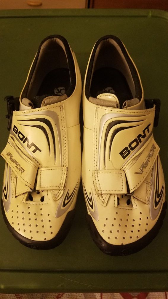 Used pair of Bont Vaypor road cycling shoes in good condition, heat moldable, super stiff, sz 43. Just to snug for me, I wear a 9.5 shoe size. If you wear a size 9 this is for you.
