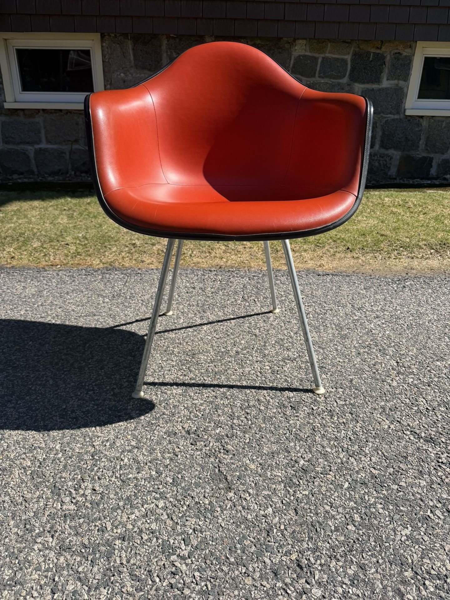 Add a bold pop of design to your space with this iconic Eames-style molded armchair by Herman Miller. Featuring a sculpted shell with vibrant orange / red upholstered seat with black trim and sleek metal dowel legs, this piece blends mid-century modern design with everyday comfort. We can deliver for an additional fee depending on location