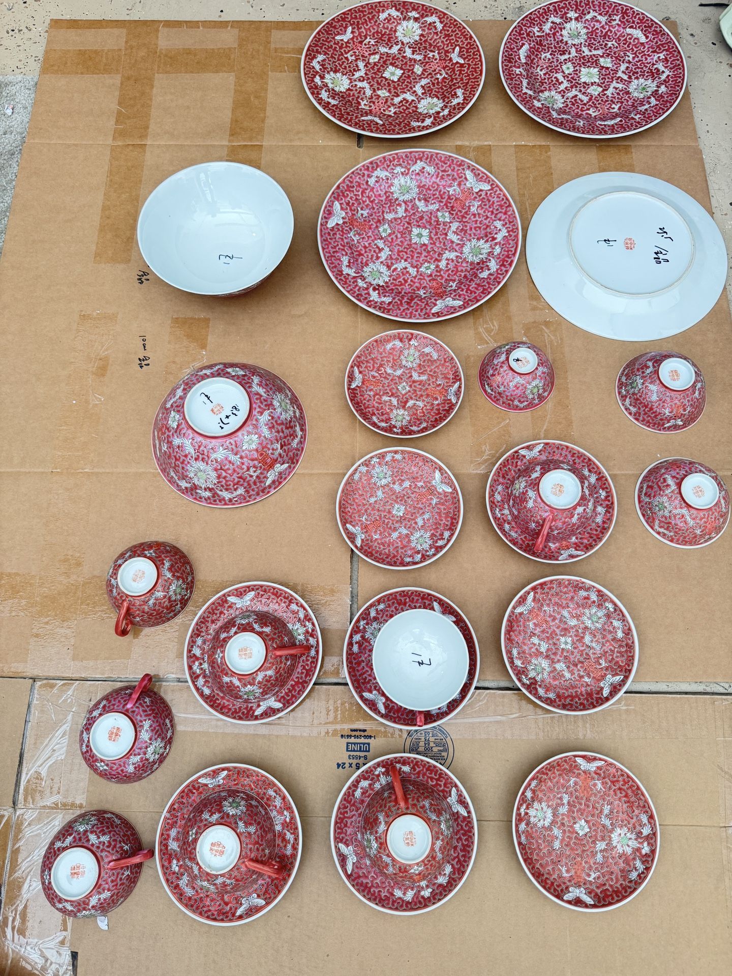 系列八:草帽款宝相花喜字系列 共计26件 都是全品 25.5 cm 盘 4个 全品 $35/个*4 18.3x 7.5 cm大碗 2个 全品 $28/个*2 9cm 茶碗 全品 $39 10cm 茶碗 2个 全 $25/个*2 14cm 碟 9个 全品 $10/个 9.2 x 5 cm 杯 8个全品 $25/个*8