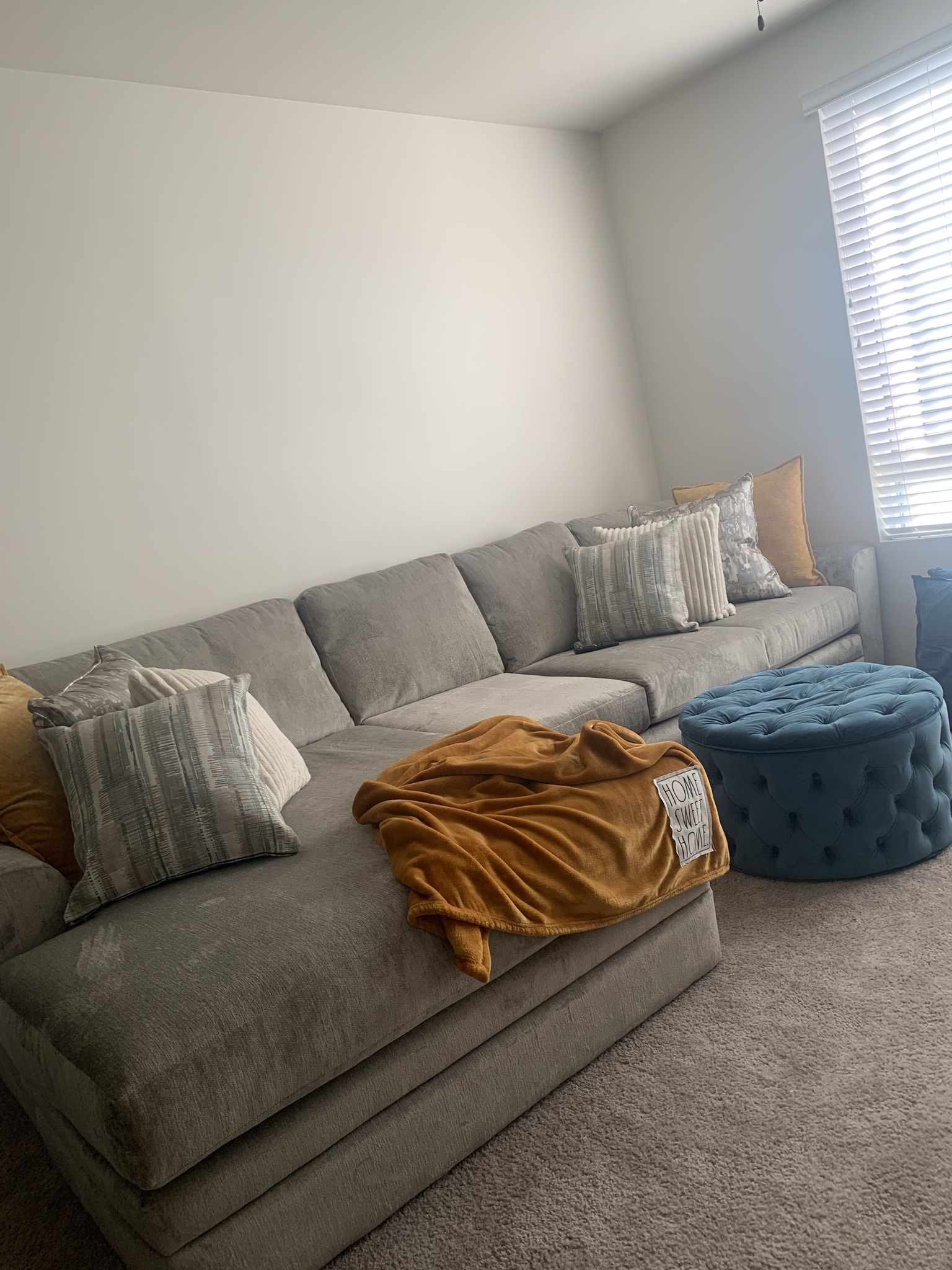 Originally purchased from Living Spaces 05/2021. Two piece sectional w/left arm facing oversized chase. Color:Fog, pattern: Ted, Collection Name: Universal , Material: 100% polyester