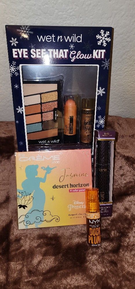 All New 🧡Jasmine The Crème Shop Disney Princesses Eyeshadow Palette 🧡Tarte mascara 🧡Wet n Wild glow set 🧡Nyx duck plump lip gloss You also could choose a new gift bag for free I have 3 different ones to choose from