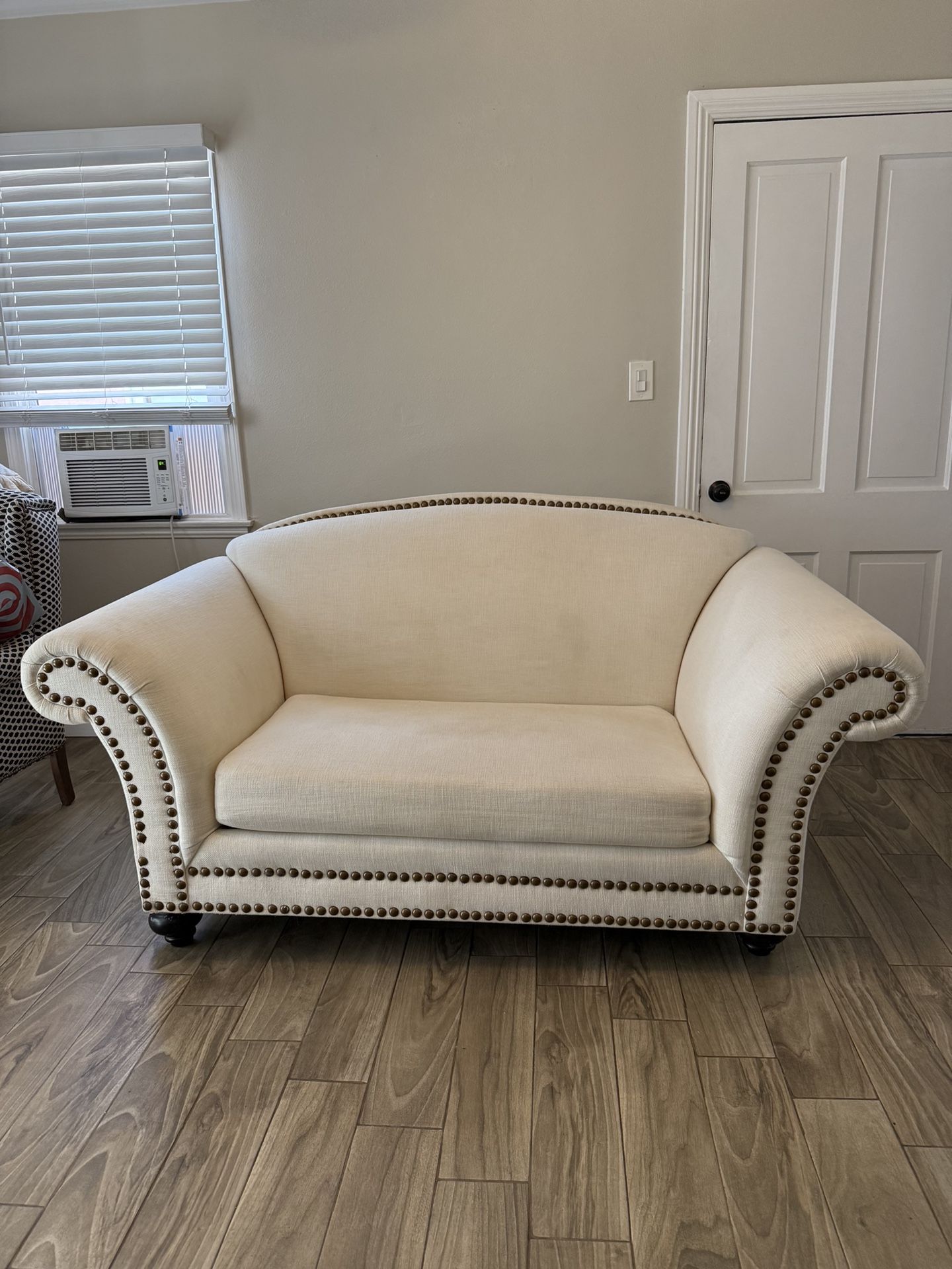 Still very minty . This got replaced with a bigger full family sized sofa . Hand custom , from color to the style . It's like a white beige creamy color . Offer up .