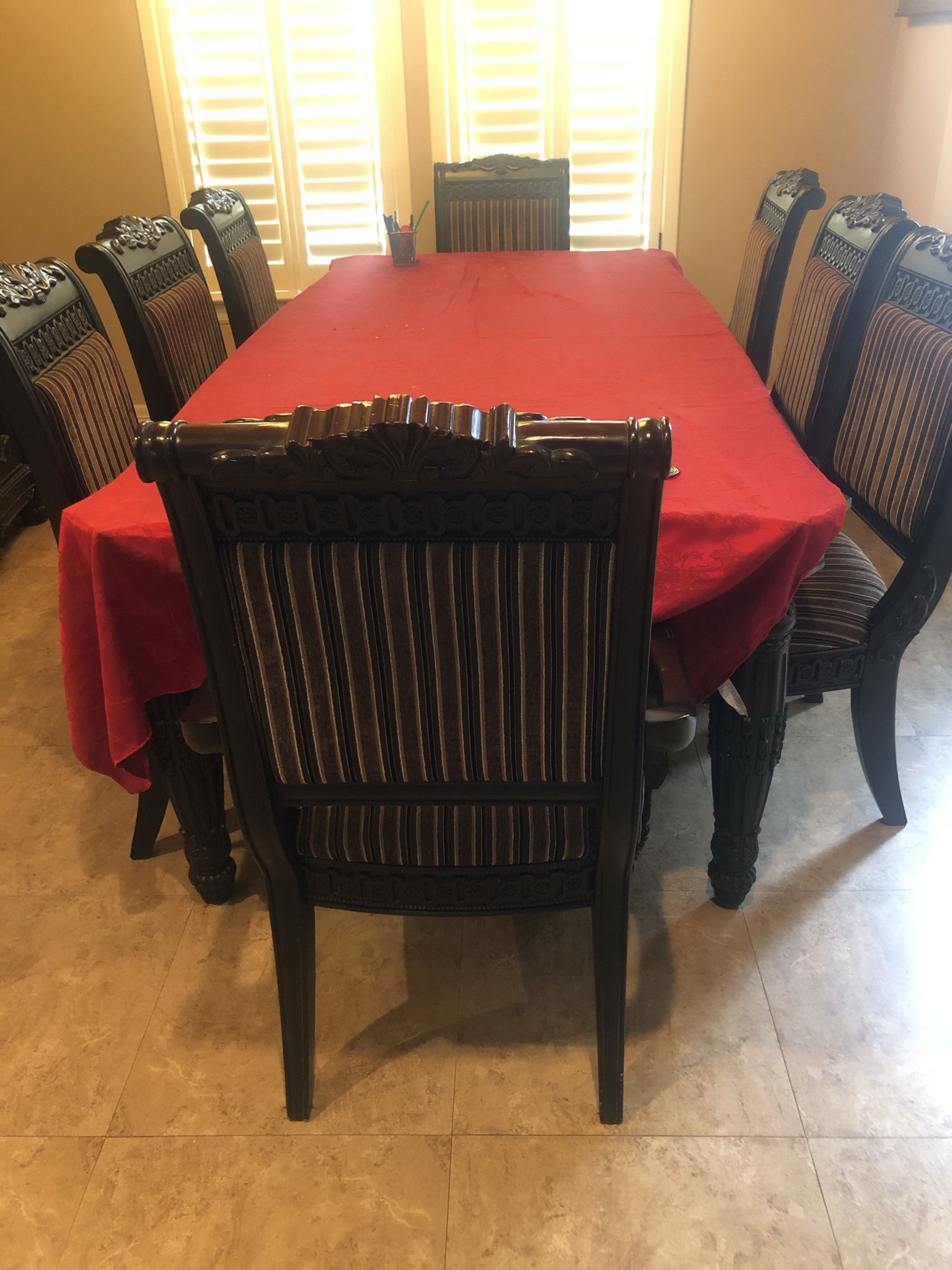 Formal Dinning table set of 8 chairs it includes 2 arm rest chairs Black finish. Includes China cabinet. Great conditions!! The table set includes 8 chairs, Table with China cabinet $800.00 O.B.O.