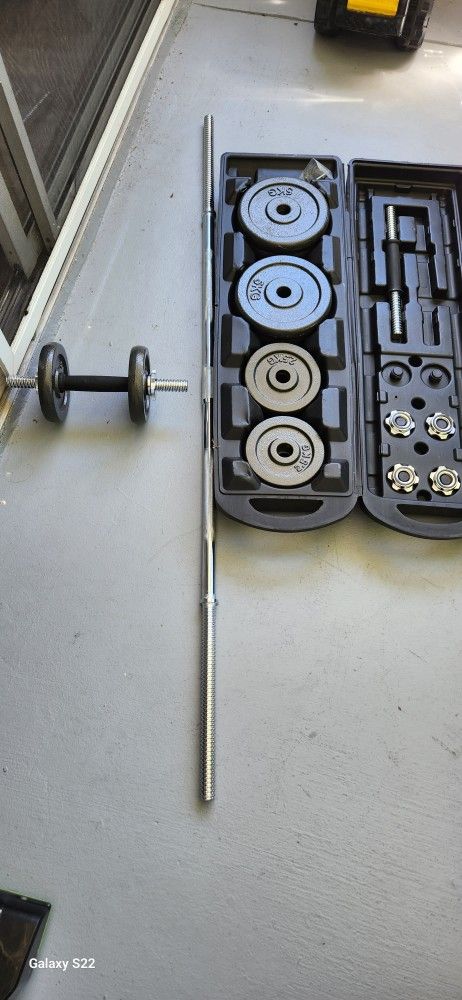 Beautiful dumbbells. Total weight 100 lbs 50 kg. Adjustable weight comes with a connector to convert into a Olympic bar. No longer needed.