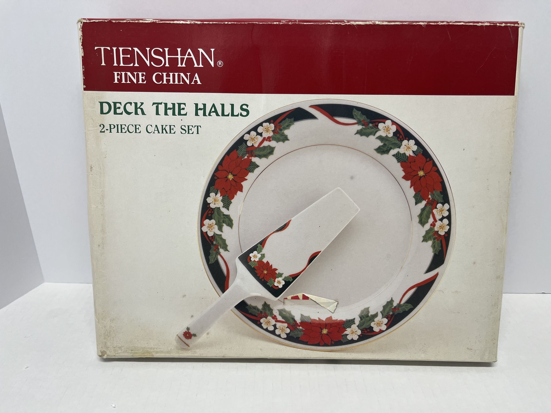 This is a vintage Tienshan Deck the Halls 2-piece cake set, which includes a 10.5-inch plate and a 9.5-inch ceramic server