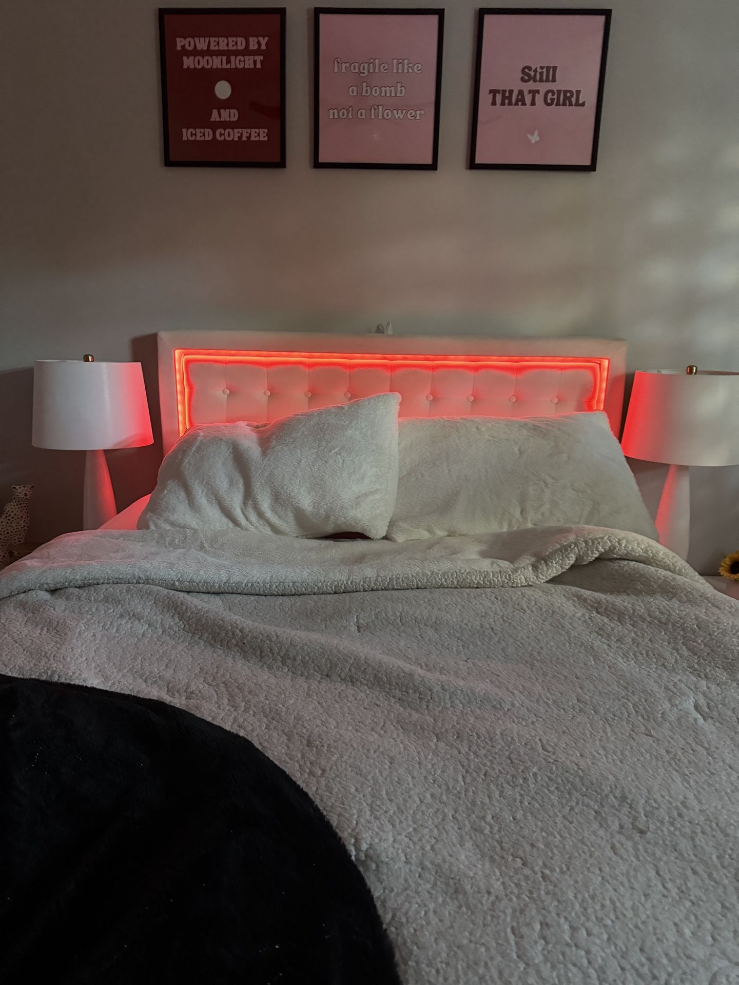 Full size bed frame beautiful headboard with LED lights only used for one year box spring included no mattress 4 Big storage drawers