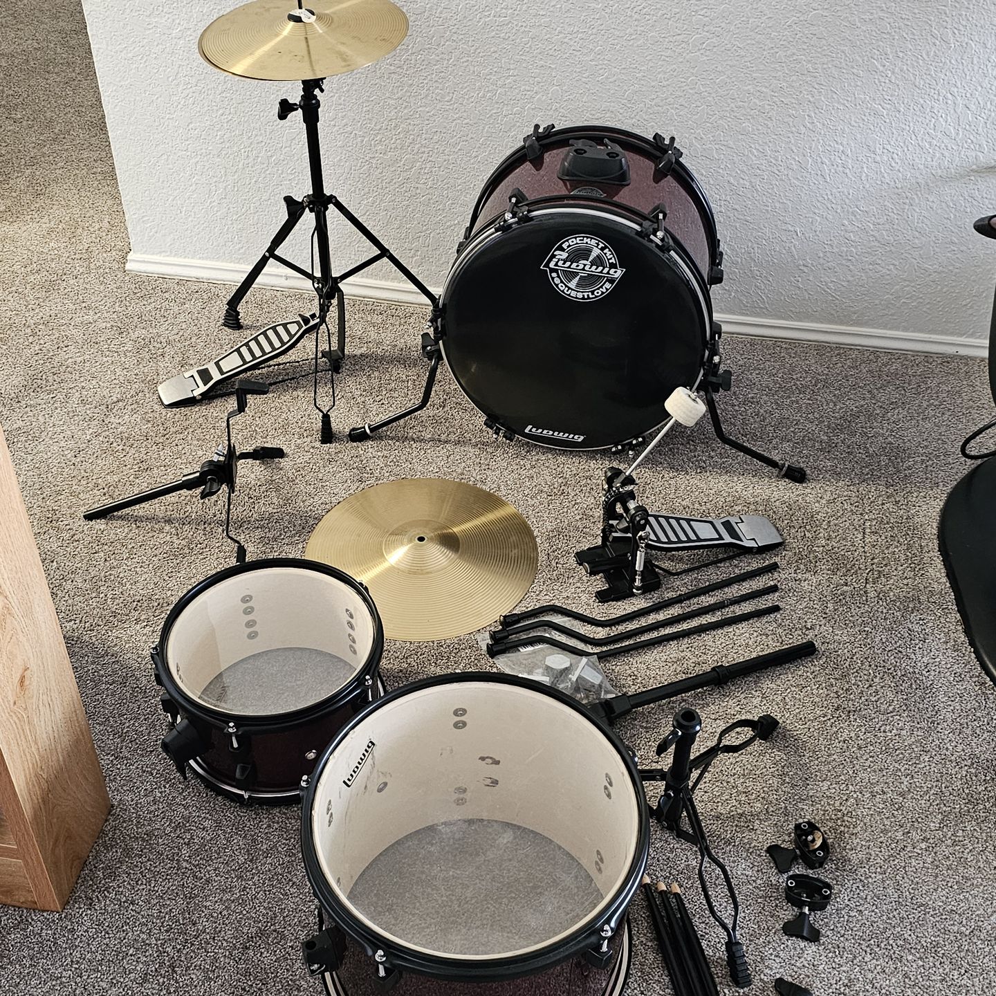 Awesome Ludwig Questlove Pocket Kit drum set. Comes with everything you see here: bass drum, two tom drums, hi-hat cymbal with stand and pedal, another cymbal, bass drum pedal, and drumsticks. Great for learning or just jamming out. Some parts need to be replaced as shown in the picture.