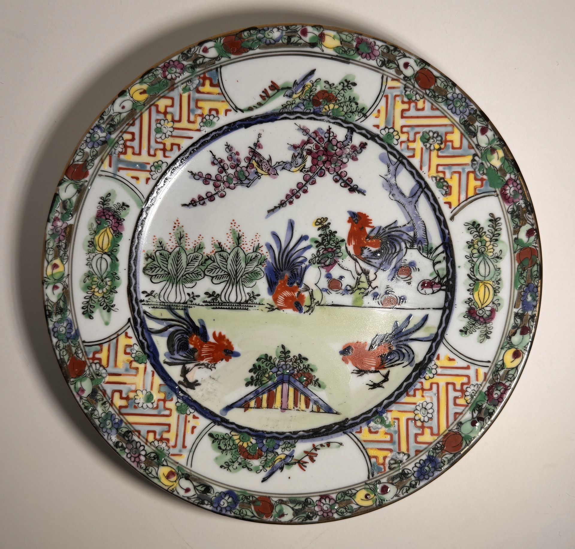 Vintage Chinese Hand Painted Happiness Plate Macau Roosters 8”