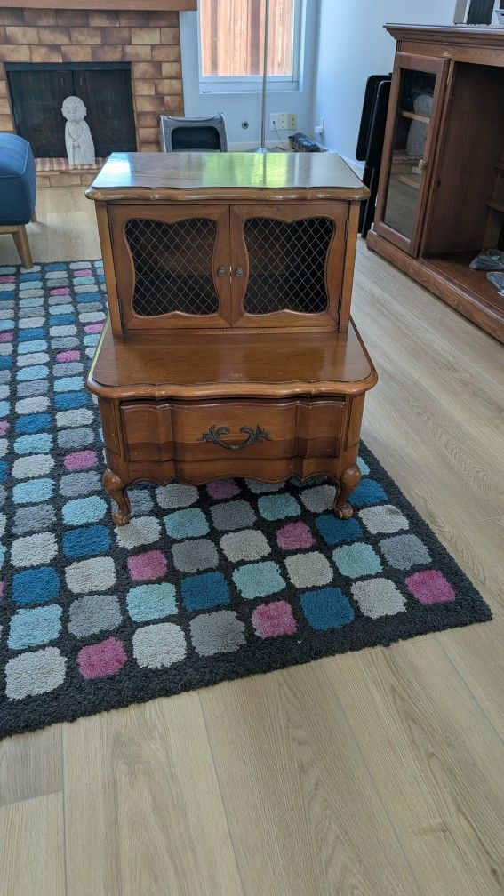 Country end table with drawer and compartment. Approx 2' x 2' x 2'. Great for use as a bedside table or living room piece. Sturdy mid-century construction.