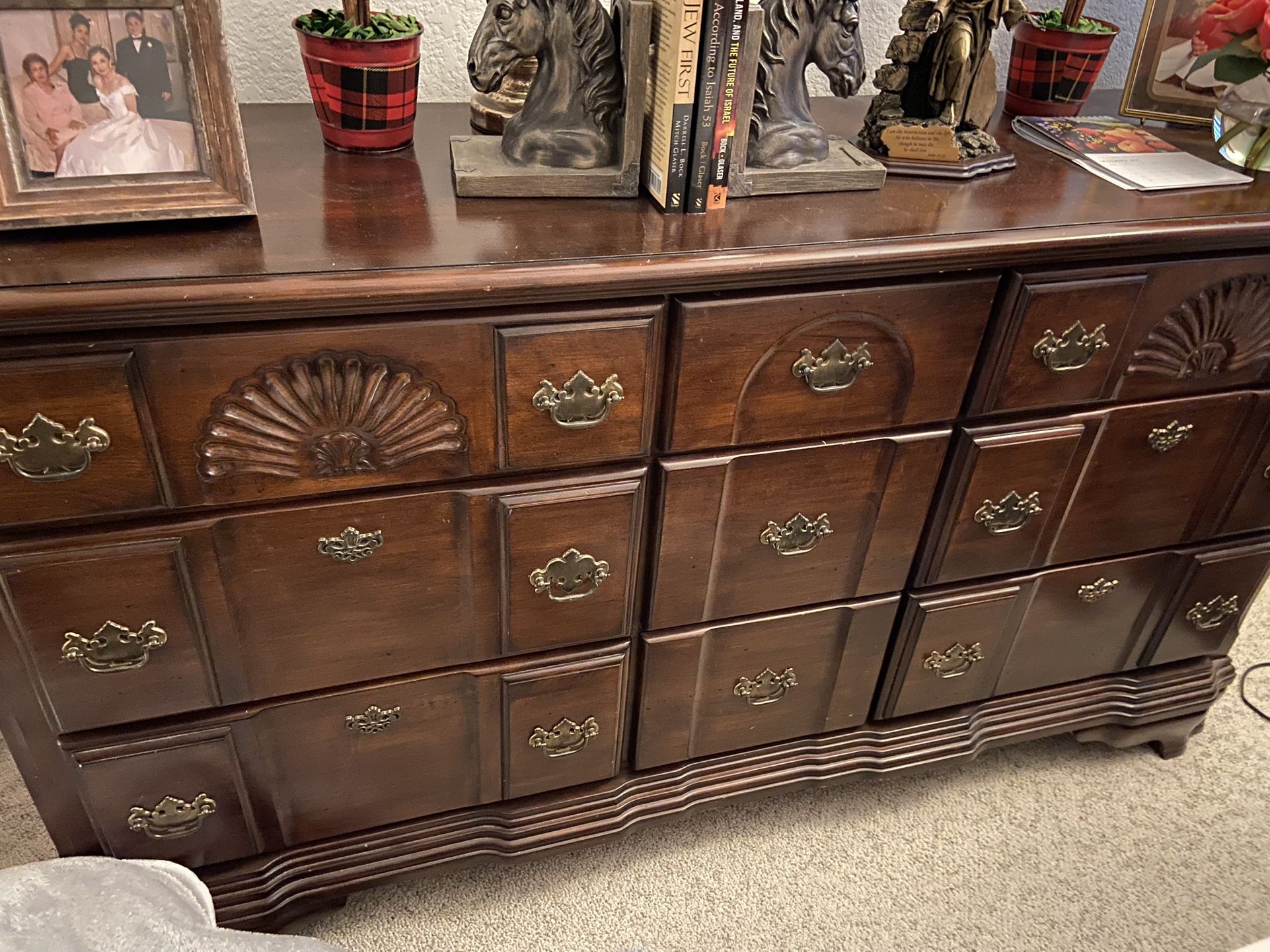 Beautiful dresser, night stand & 4 poster queen bed without mattress.