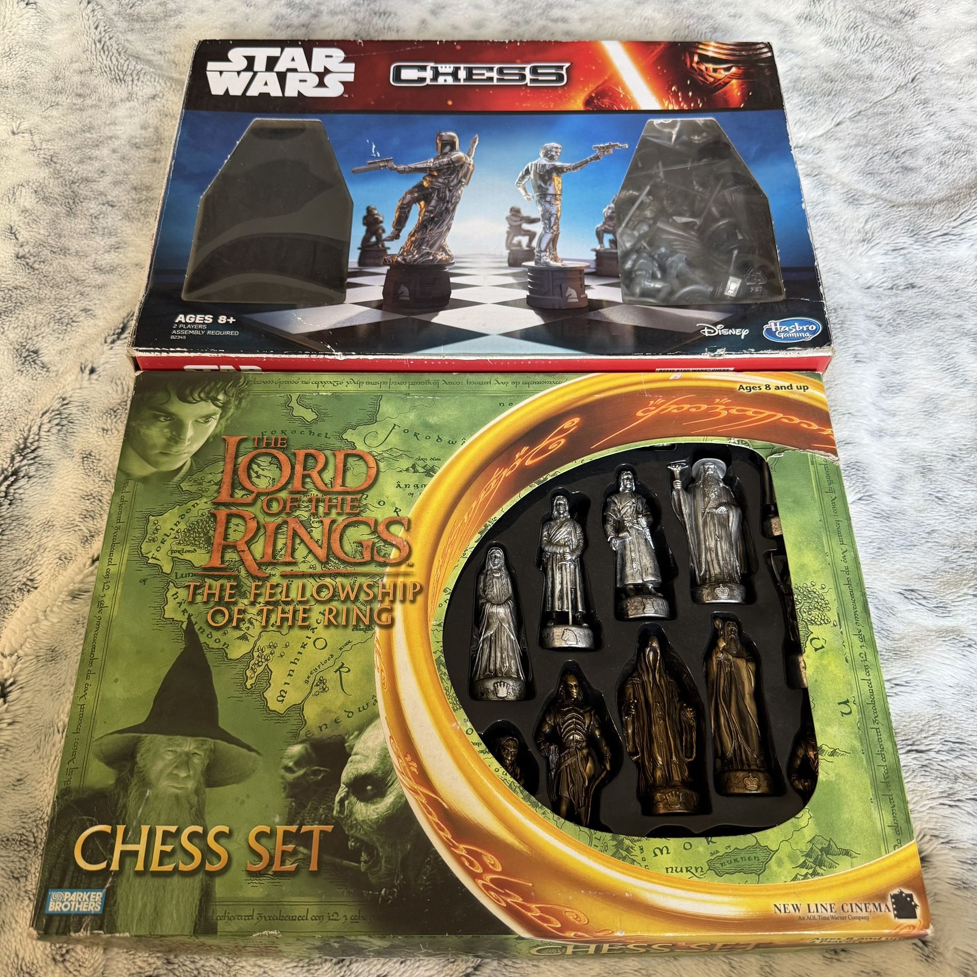 Pick up only Lot of 2 chess sets Both are used but complete The sets themselves have had minimal use over the years. The Lord of the rings set was maybe played with 3 times The Lord of the Rings set box is in decent condition The Star Wars set was used more often but still in great condition The Star Wars set box isn’t in good shape as it was opened many times for use by the kids Offers accepted Any questions feel free to message me