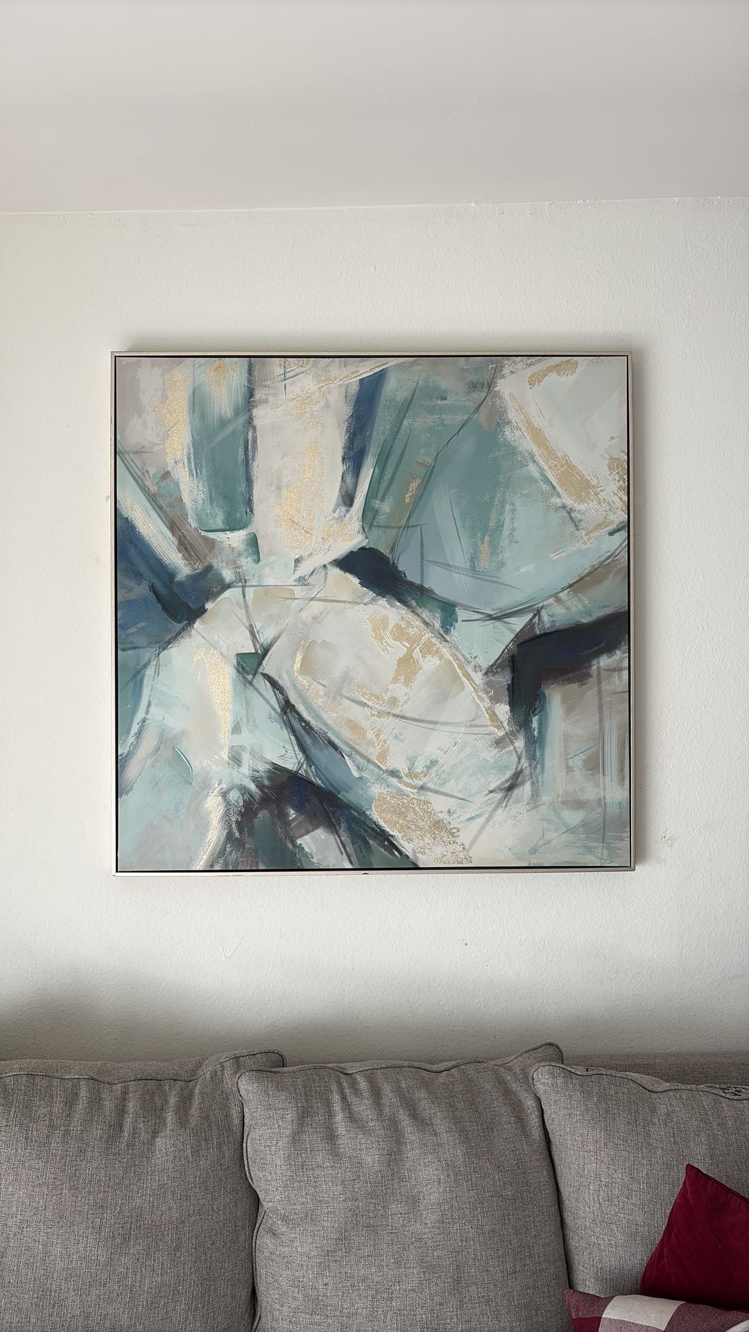 Elevate your space with this oversized square statement piece. Featuring a contemporary abstract design in deep navy, teal, and metallic gold accents, it’s perfect for a living room, bedroom, or office. Details: • Dimensions: 39.5” x 39.5” (nearly 40 inches square). • Style: Modern / Contemporary • Format: Canvas with a metallic-finish frame. Condition: • The canvas itself is in excellent condition with no fading or marks. • Note on Frame: There are a few minor scuffs/chips on the bottom and corner of the metallic frame (see last two photos for close-ups). • These imperfections are barely noticeable when hanging Pick-up Info: • Must be able to pick up in Reseda. Please ensure your vehicle can fit a 40" square.