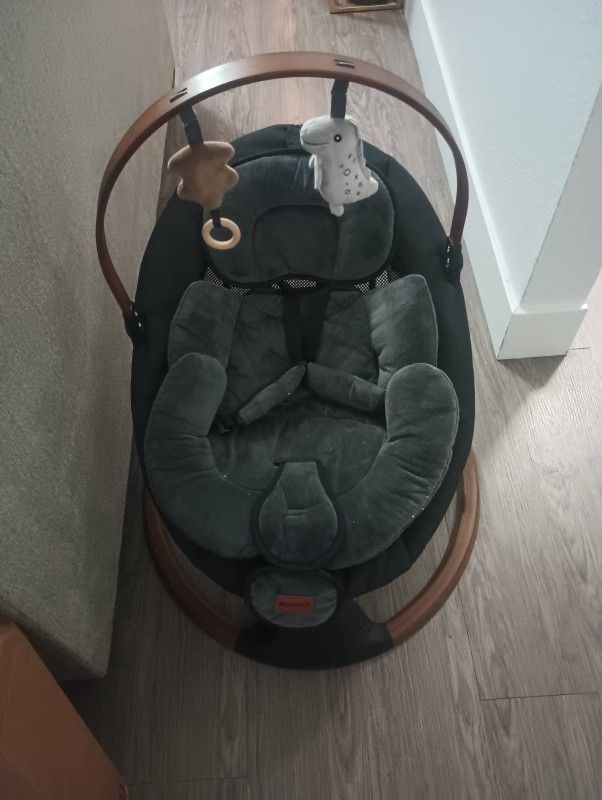 Monamii baby swing. You can connect your phone via Bluetooth to play music of choice. It comes with 2 cords and remote. Opened, but never used.