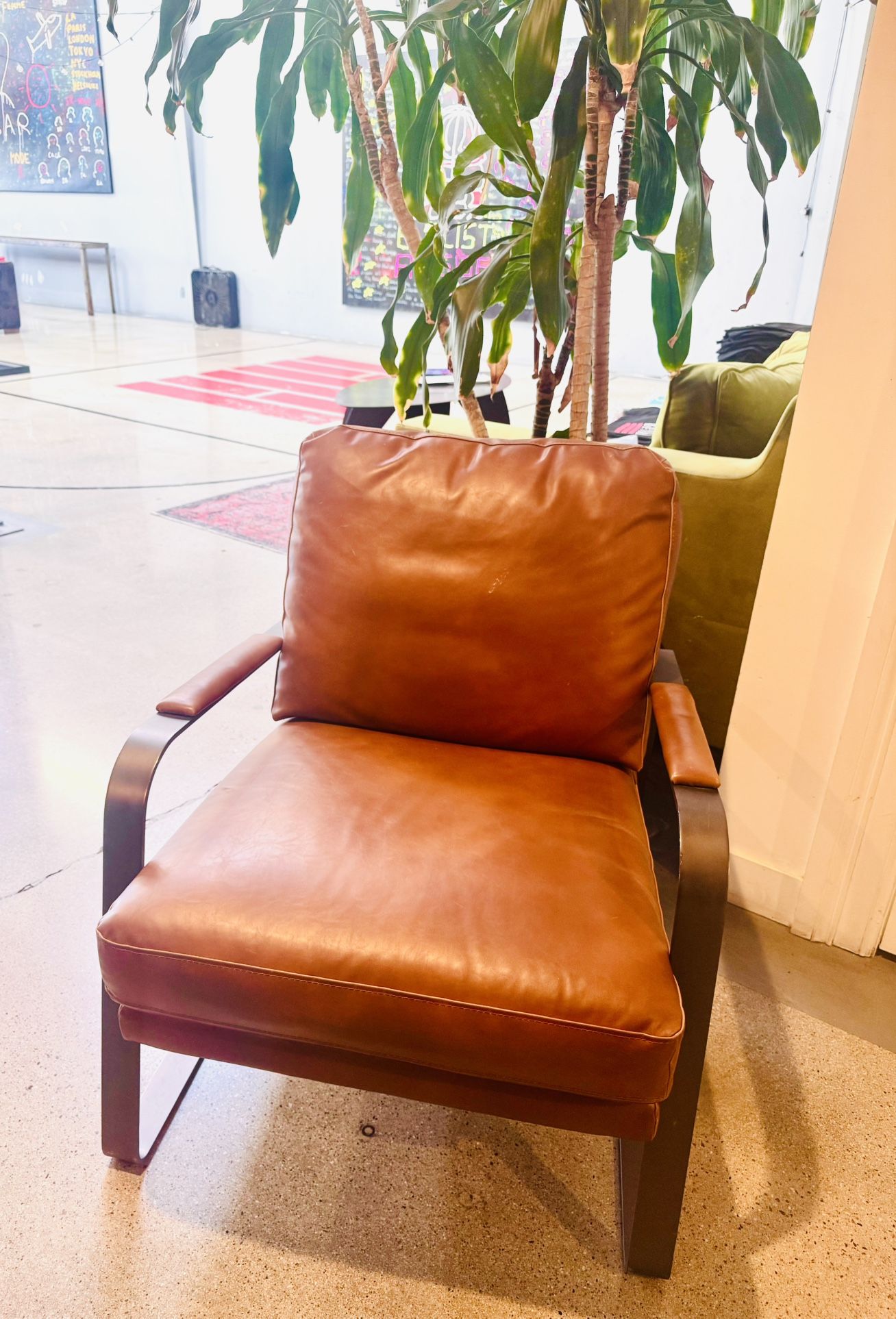 Size: 27” x 32” x 33” Rich brown color, premium vegan leather material. Strong, comfortable & built to last – cruelty-free luxury! Easy to clean, timeless style that fits anywhere. Pick up in Santa Monica, CA