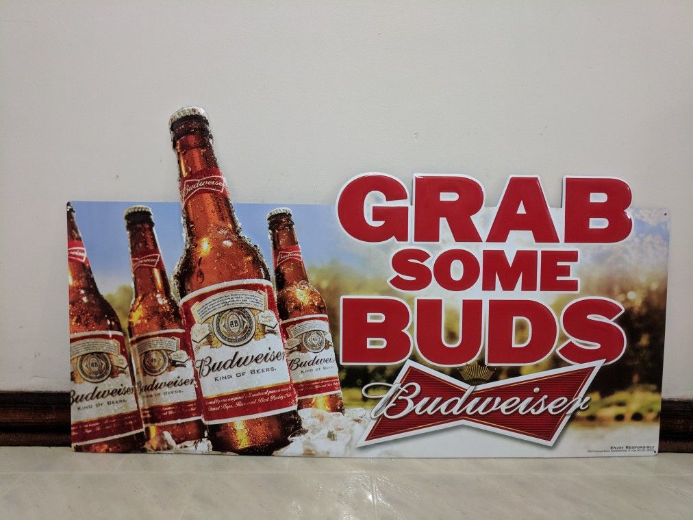 I have a Budweiser Metal / Tin Sign for sale. It measures 33 inches wide and 19 inches in height. If you have any questions, please feel free to message me. Thanks😀