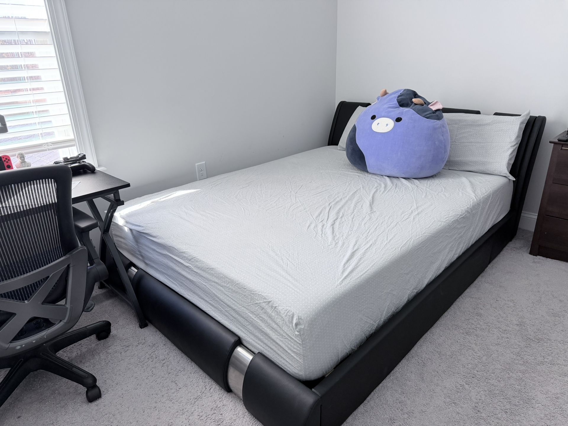 Modern black faux leather bed frame with a padded headboard and silver accent panels. Sturdy, stylish, and comfortable—great for a bedroom or guest room. Rarely used, very good condition, well maintained, from a smoke and pet free home.