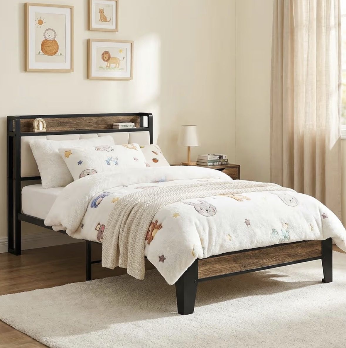 Used for about a year, no damages in great condition just getting a new bed. Charging port on top includes 2 plugs and 2 usb ports, works great. Mattress needs to go too, very comfortable! Pick up only