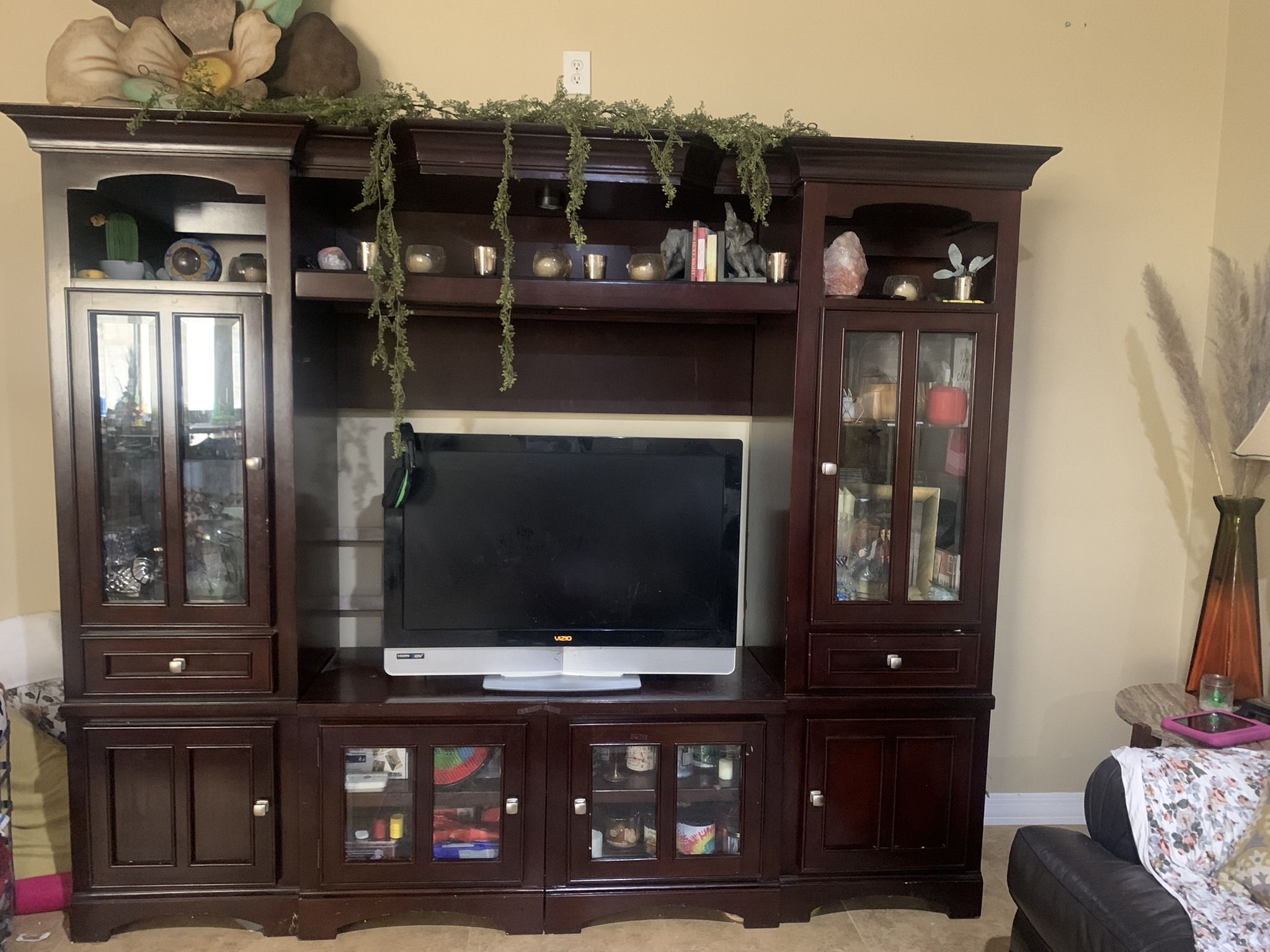 Beautiful entertainment center 6 feet tall 7 feet 20 in long 20 in depth Lots of storage space Has very minor scratch on bottom Leg