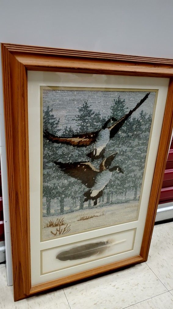 Canadian Geese In Flight Needlepoint With Feather