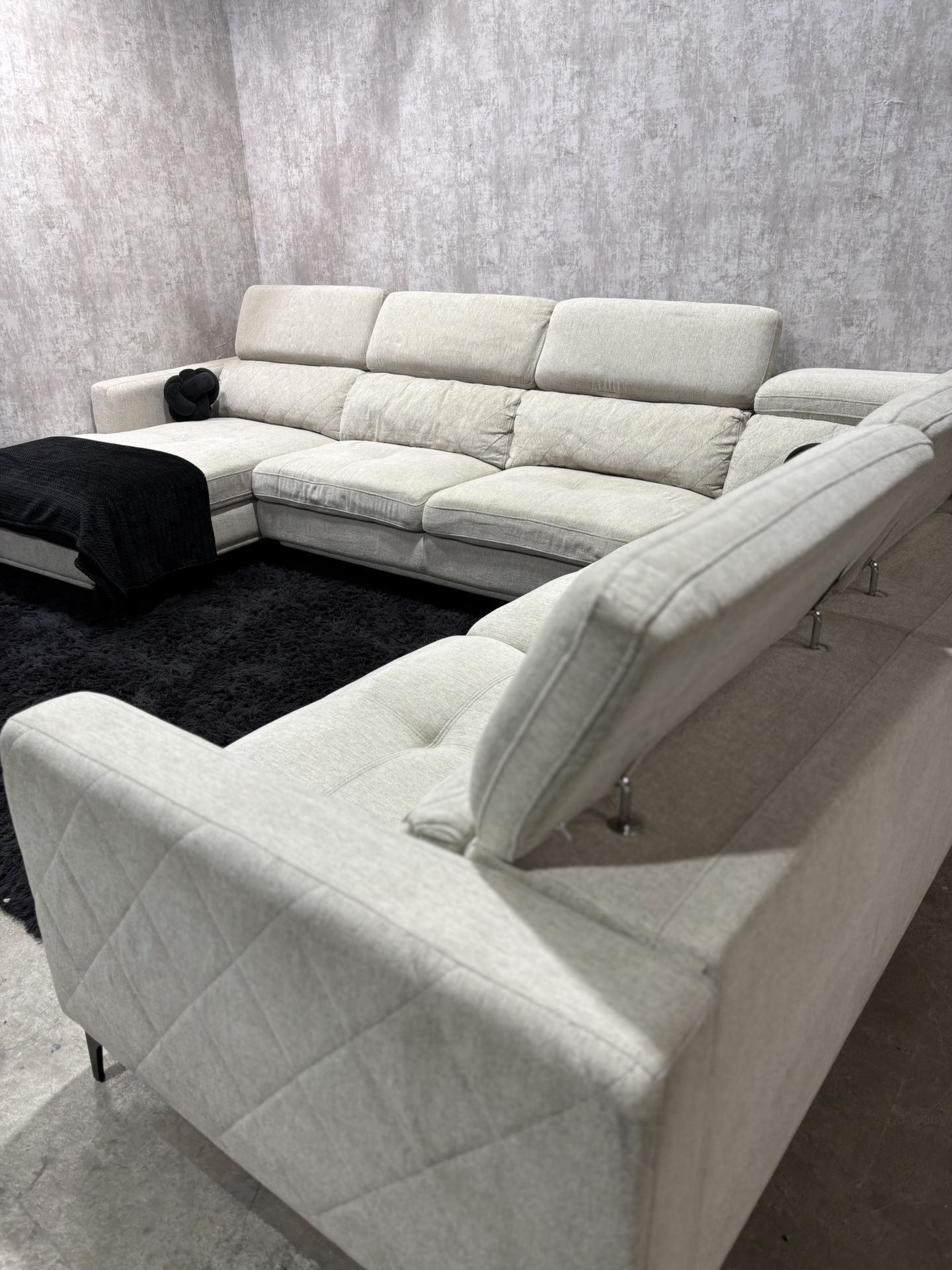 Comfortable and stylish Modern sectional 4pc sofa in a light Gray fabric. Features adjustable headrests for customized support. Perfect for a living room or entertainment area. Includes a chaise lounge section. Excellent condition, gently used. Get ready to relax! Headrest are fully functional missing screws makes it a little loose But this doesn’t affect functionality. I offer Free delivery Depending on distance 🚚✅
