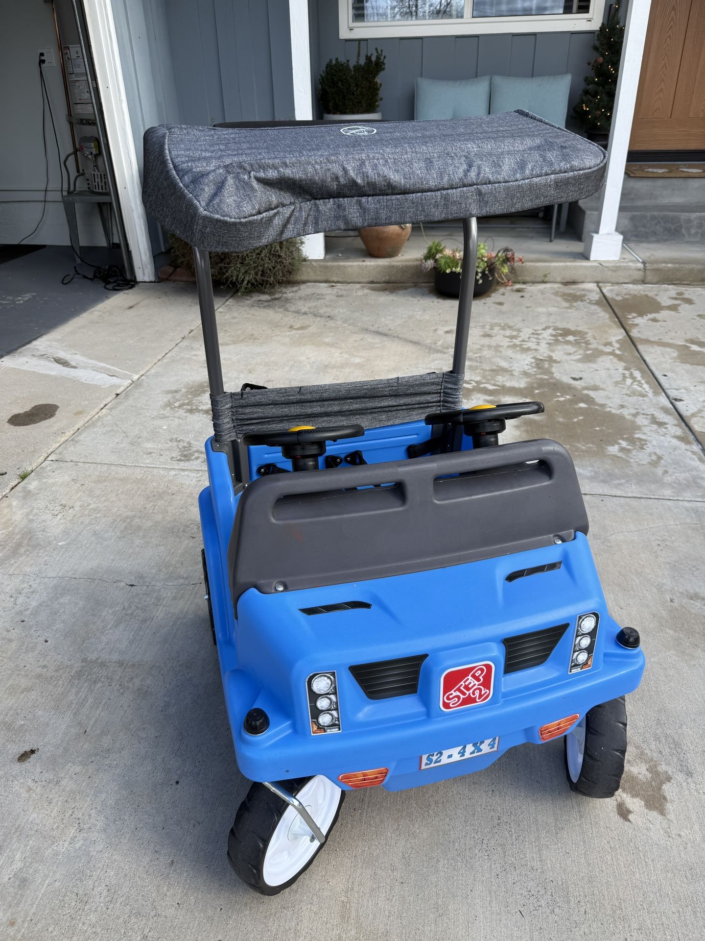 Gently used Step2 ride-on push car in great condition. Features a sturdy design with smooth-rolling wheels, steering wheel, and a removable sun canopy for shade. Includes parent push handle for easy control and a comfortable seat for toddlers. Perfect for walks, outdoor play, or the park. Clean and well cared for, no cracks or damage.