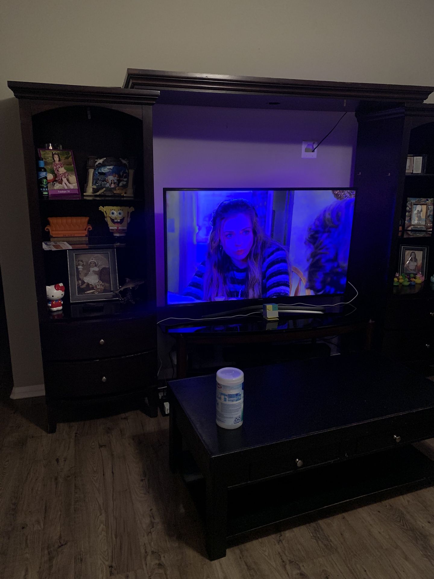 the entertainment center has the tower that go across the top has lights on it and couches dark gray color