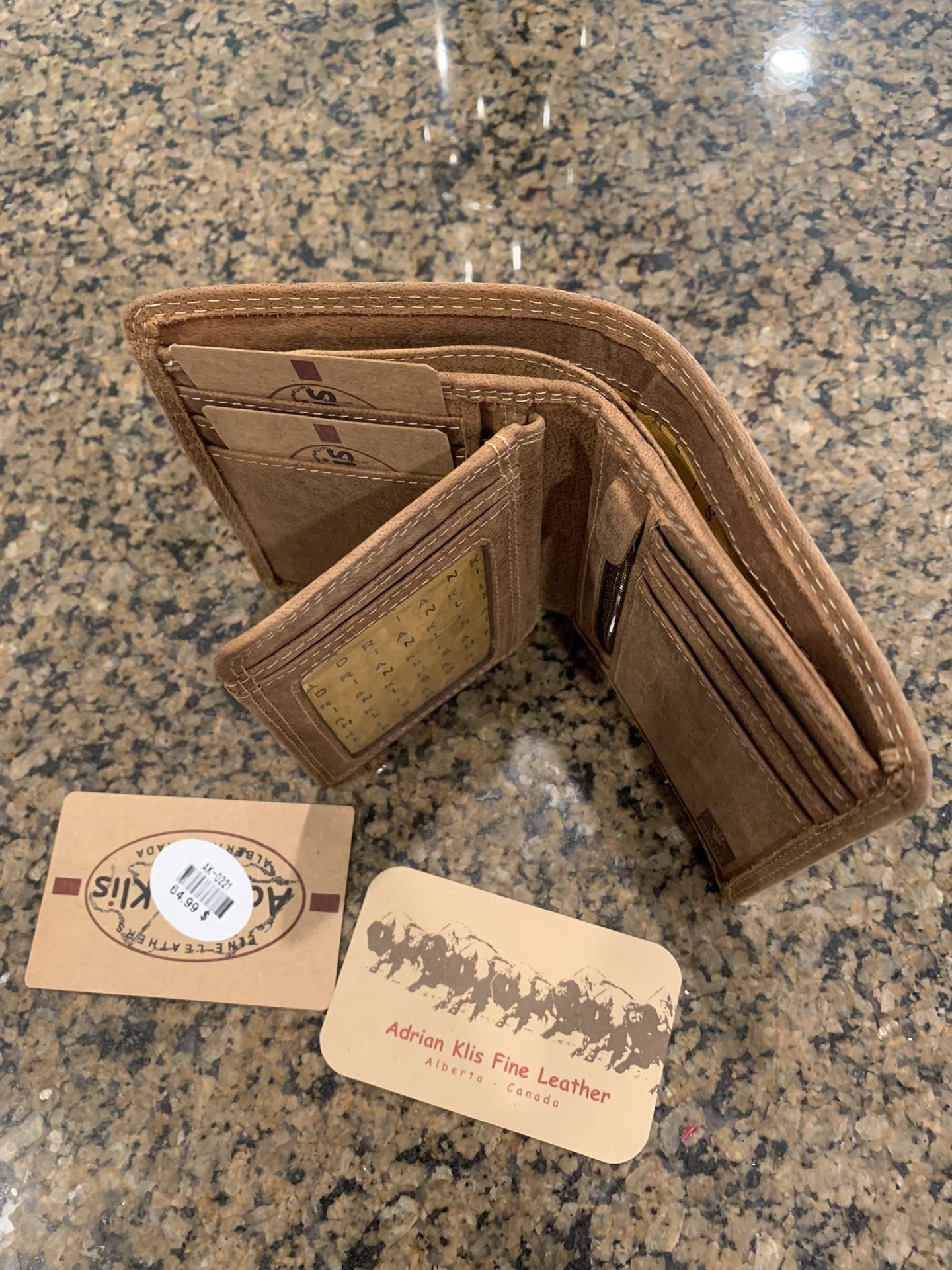 100% Distressed Leather wallet, handmade in Canada. Brand New! Wallet is double-stitched, has room for at least 10 credit cards and one photo window ID.