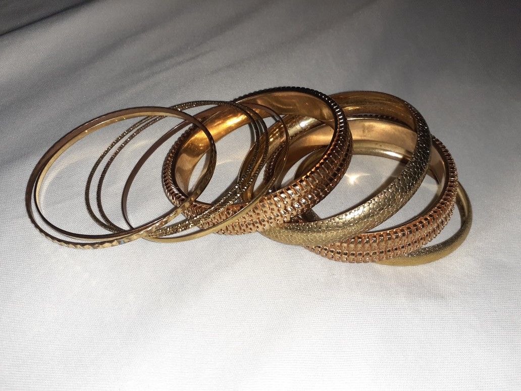 8 bracelets. Brand New. Not real gold, but very nice jewelry. It doesn't fit me and I don't want them. Cash Only. $6.00 for all of them or better offer.