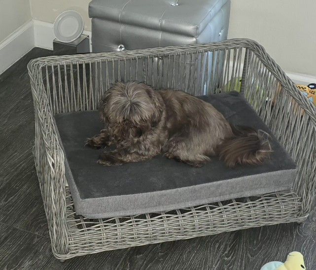 Wicker grey Dog Bed frame with Grey sturdy mattress style, with zipper to Wash outer cover..I have 2 of them. Was given as a gift but my dogs have enough beds. My Coco just modeled the bed mattress upside down.