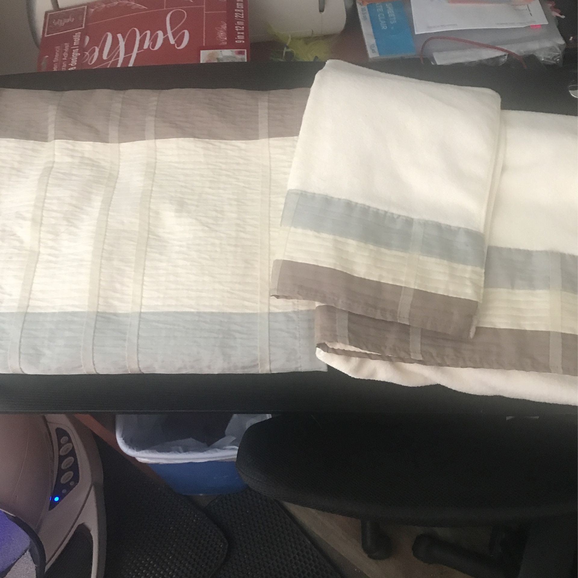Beautiful elegant Croscill shower curtain. Fairfax line. Cream, a muted grey-seafoam, and creamy brown. Matching towel and hand towel were used for decoration only.