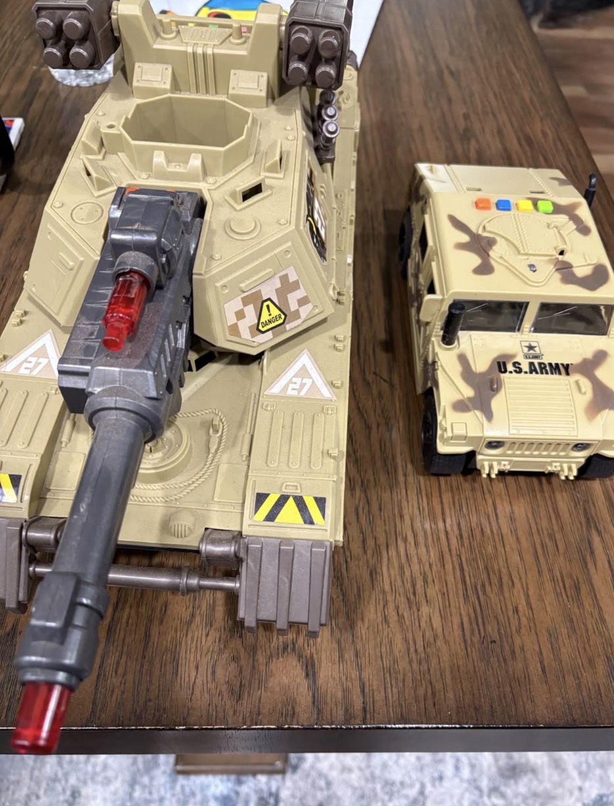 Army Tank with an Army vehicle In great condition. Tank makes noise and is 18-19” long