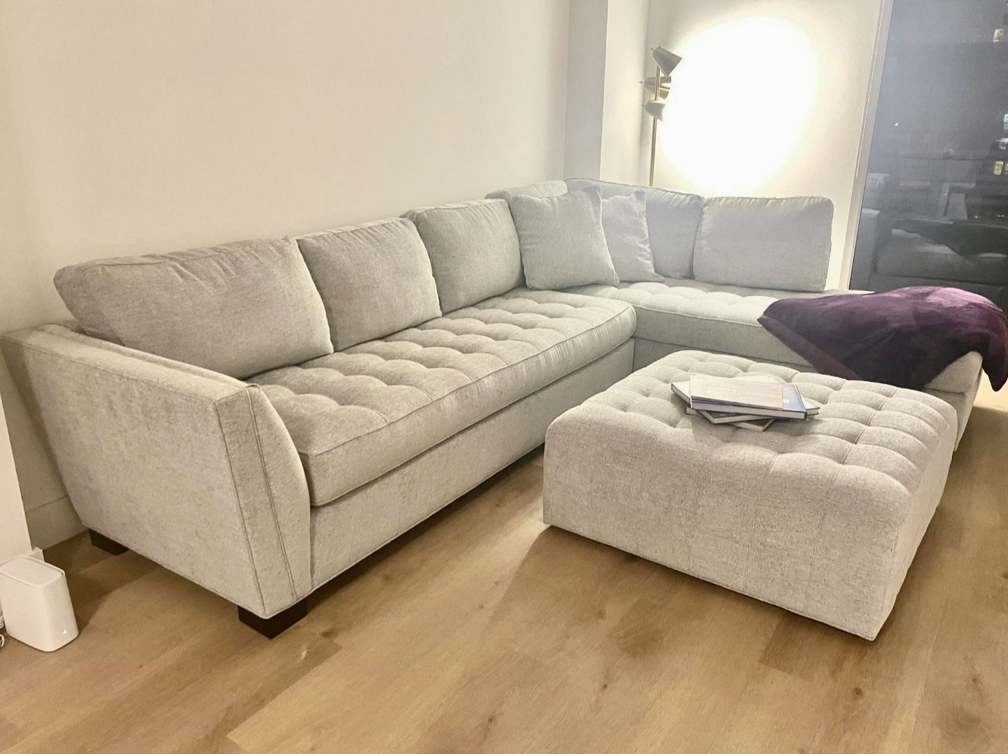Comfortable Back & Seat Cushions. Smooth Durapella® Microsuede Fabric. Two Sections: LAF Sofa, RAF Chaise. Excellent Shape. Original Condition. Professionally Steam Cleaned. Filone Model by Ashley HomeStores. $1,250+ Retail Value. Dimensions: Width 112in, Chaise 86in, Seat 19in, Depth 39in, Height 38in. Pickup in 92109 or Delivery with Zipcode.