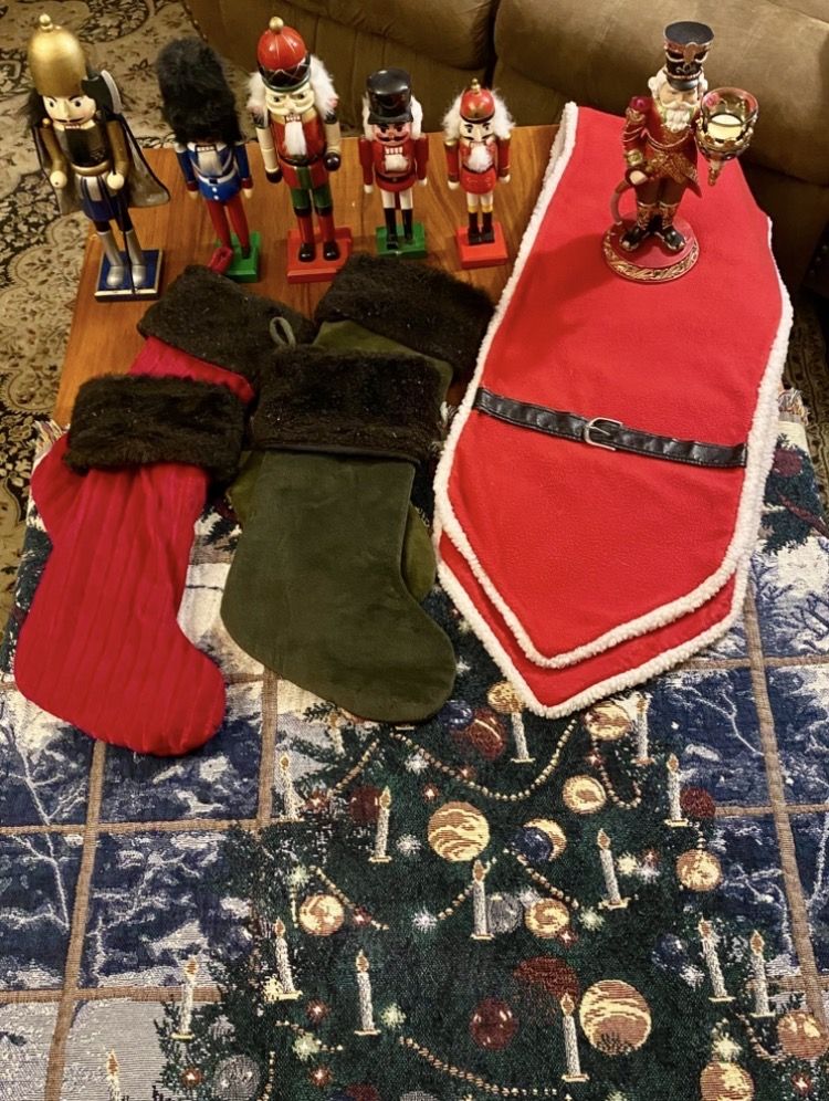 This product is a lot of 12 Christmas items including 6 wooden nutcracker figurines, each measuring between 12 and 19 inches in height. These decorative Christmas collectibles feature a traditional nutcracker design in multicolor, perfect for adding festive charm to any holiday decor. Made of wood and intricately detailed, these figurines are a great addition to any collection or a thoughtful gift for adults who appreciate classic Christmas decorations. The lot also includes a tea light holding Christmas soldier, a 6’ table runner, a 4’3”x4’ throw, 2 red stockings & 2 green stockings.