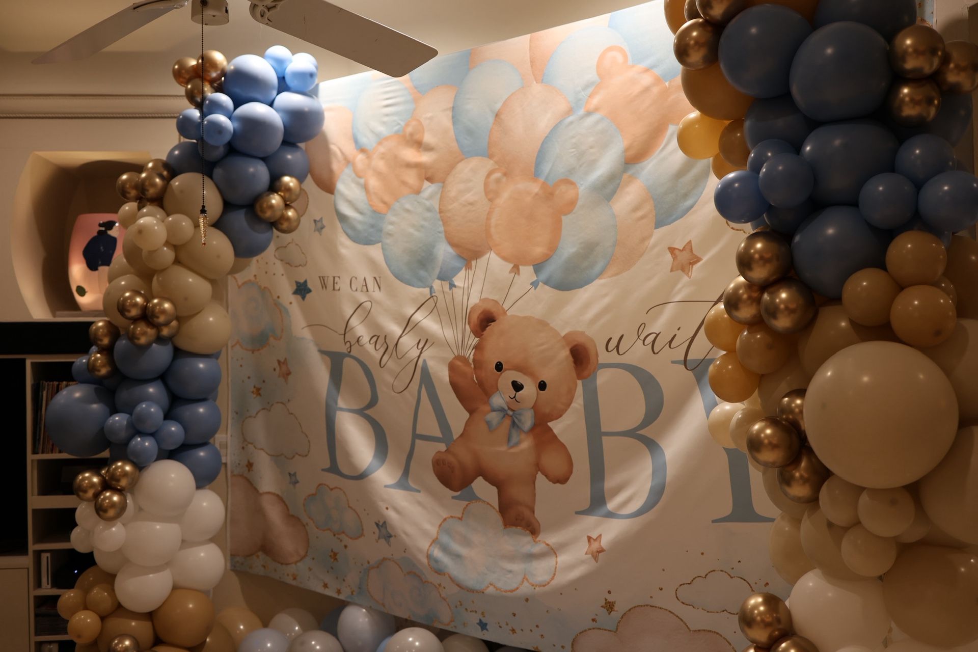 Everything included worth over $300.00. “We Can Bearly Wait” Backdrop cloths ( 10’ x 7’, 8’x 6’, 7’x5’ ) 2 brackets to make Balloon Arch. Matching Balloons, 3 large Teddy Bears, 2 small Teddy Bears, several tiny Teddy Bears. Table Confetti. Mommy Advice game cards. 2 rolls of 1 inch Ribbon. Magnetic calendar with erasable colored markers. 27”x 17” Late Night Diapers game instruction board. 42” x 36” We Can Bearly Wait announcement board.