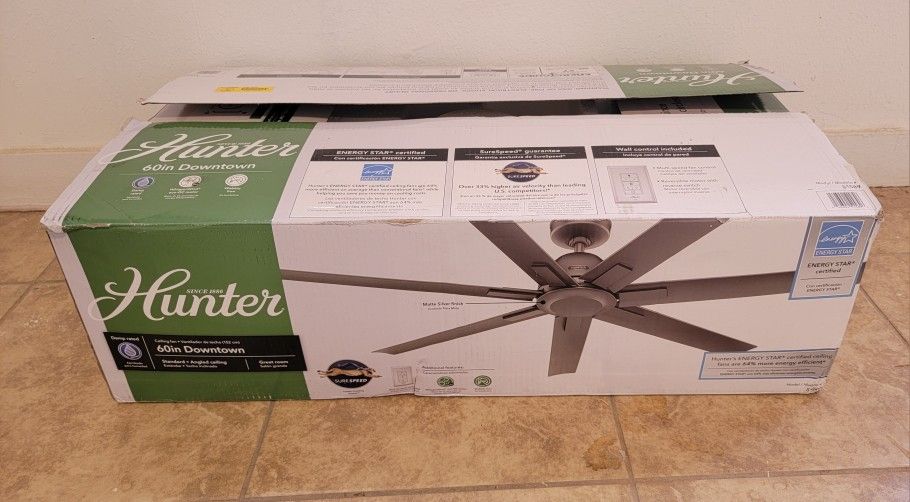 $200 OBO Model #: 51589 Purchased from Amazon – retails for $329+ Brand new, never used, still in box. Hunter 60" Downtown Ceiling Fan in Matte Silver. Perfect for large rooms, covered patios, or garages. ENERGY STAR® Certified — 64% more efficient SureSpeed® Technology — 33% higher air velocity Wall Control Included – 6-speed control with reverse switch Damp rated – great for indoor or covered outdoor use WhisperWind® DC Motor – ultra-quiet, wobble-free performance
