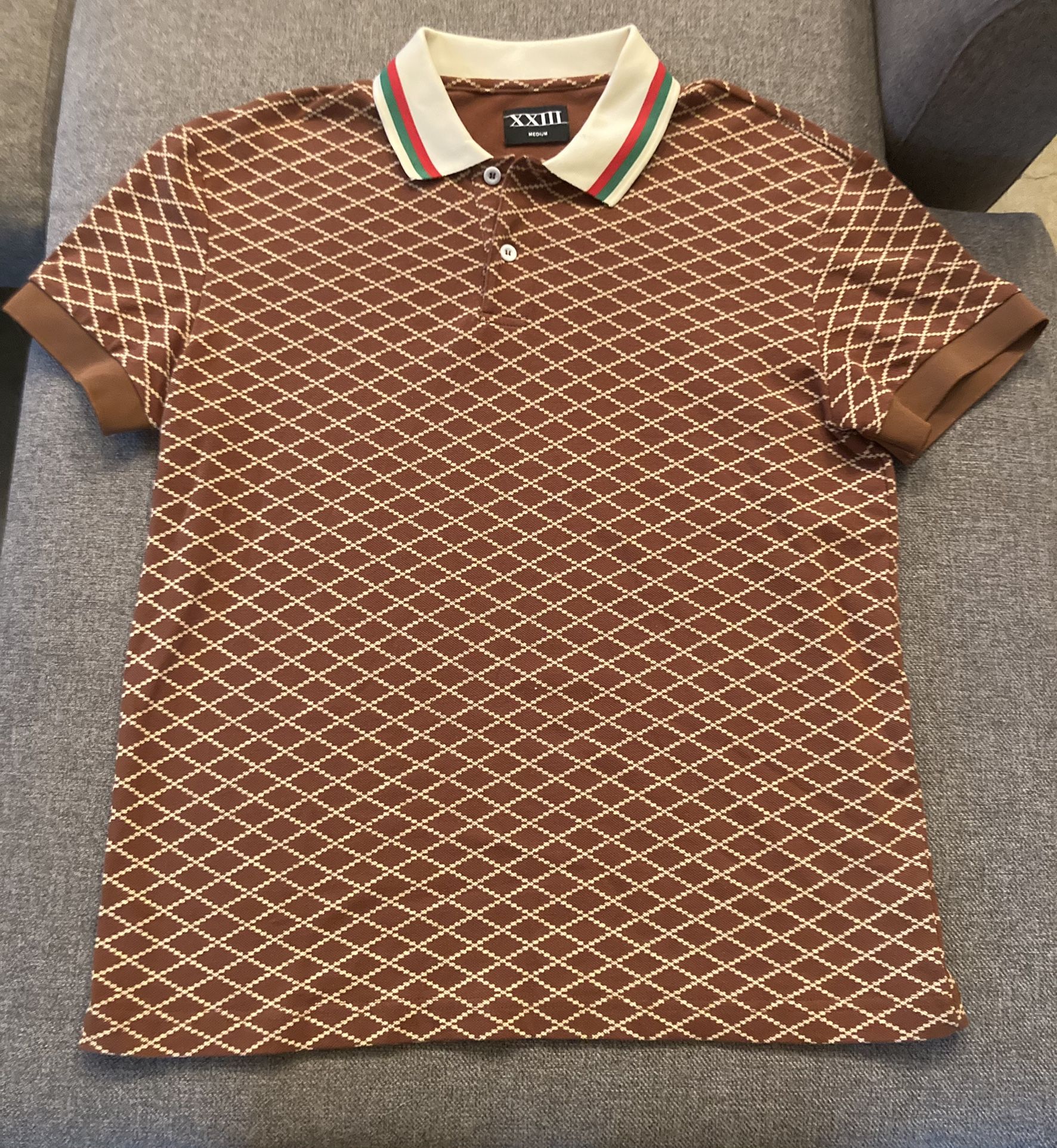Men’s printed polo by XXIII, size Medium. Stylish geometric print, rich cafe brown color. Off-white collar with red and green stripes. Never worn.