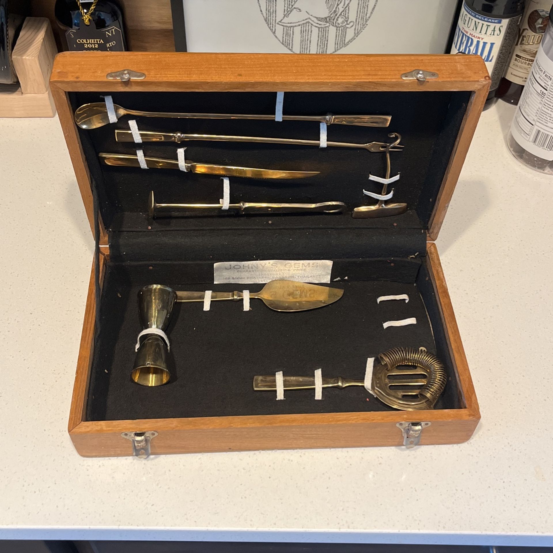 Vintage brass cocktail set with handmade wooden box.