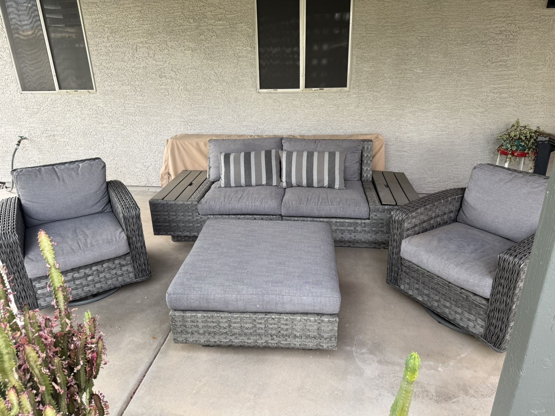 Good condition and stored under covers. Includes: Sofa with storage end tables 83” wide total; 50” wide seating Two swivel chairs Ottoman 33” square Some accent pillows Wicker is in great shape, no tips or tears Originally from Living Spaces