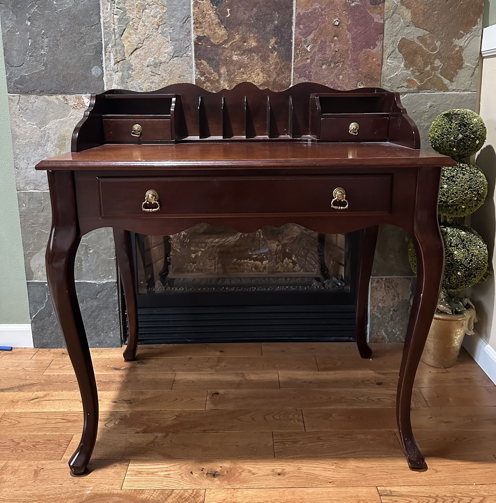 Beautiful solid wood dressing table with an oval mirror. Beautiful artificial flowers are given away for free. Cash only. Dimensions: 21 inches deep, 32.68 inches wide, 34.25 inches high at the back, and 28.25 inches high at the front.